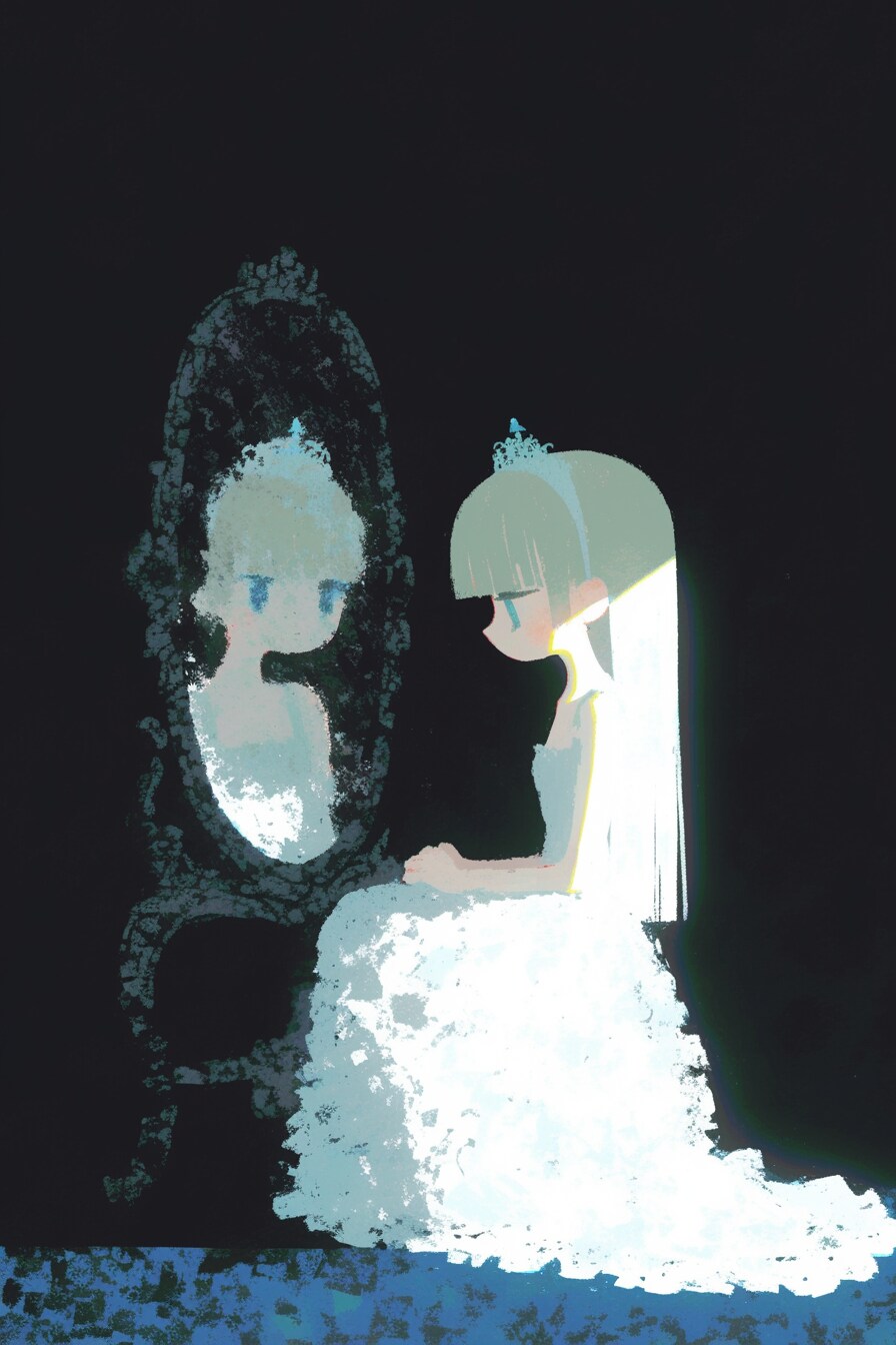虚飾は人。鏡と実際の姿が異なるイラストを目指しましたが、どうにもうまくいかないので採用したのはレタッチした。