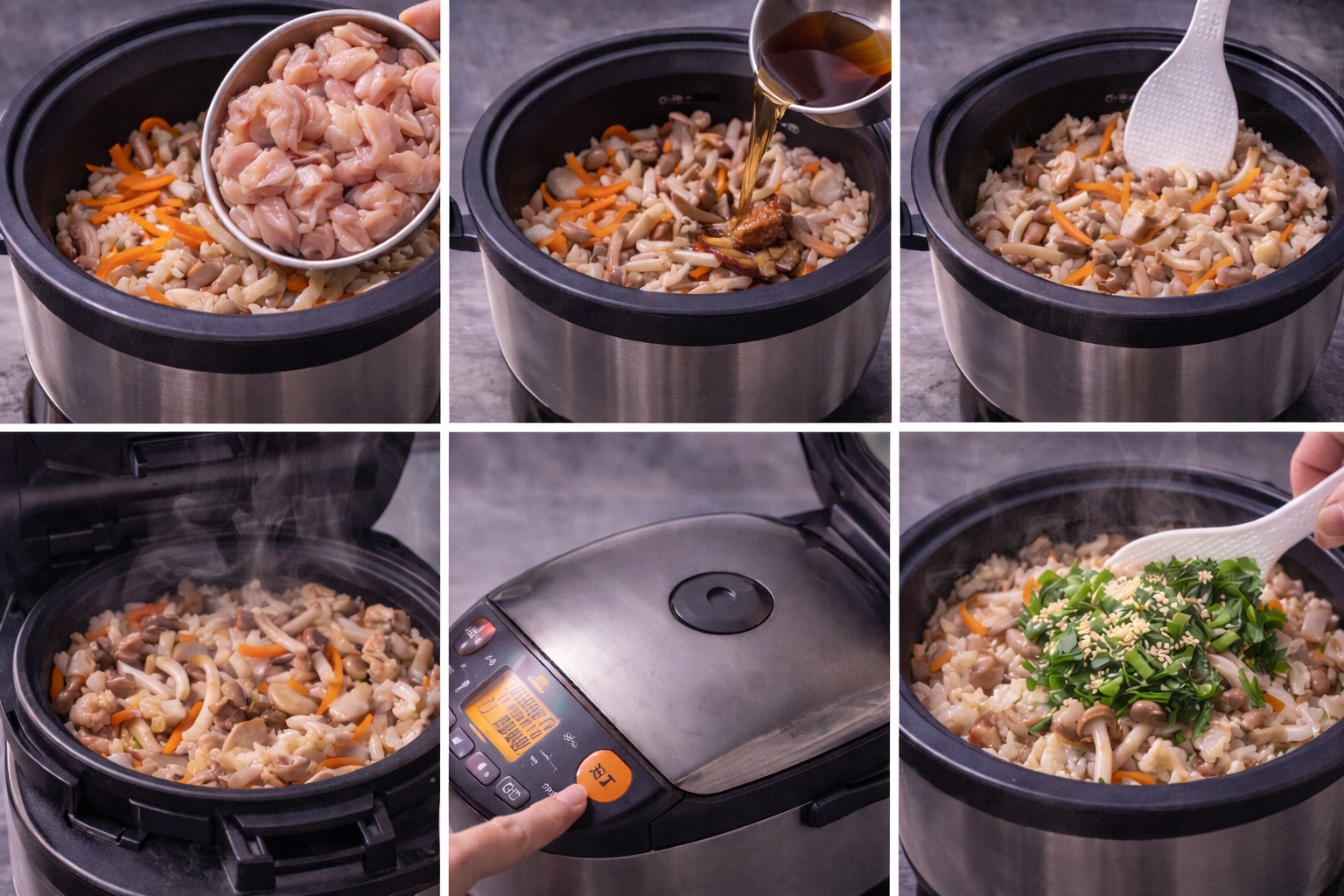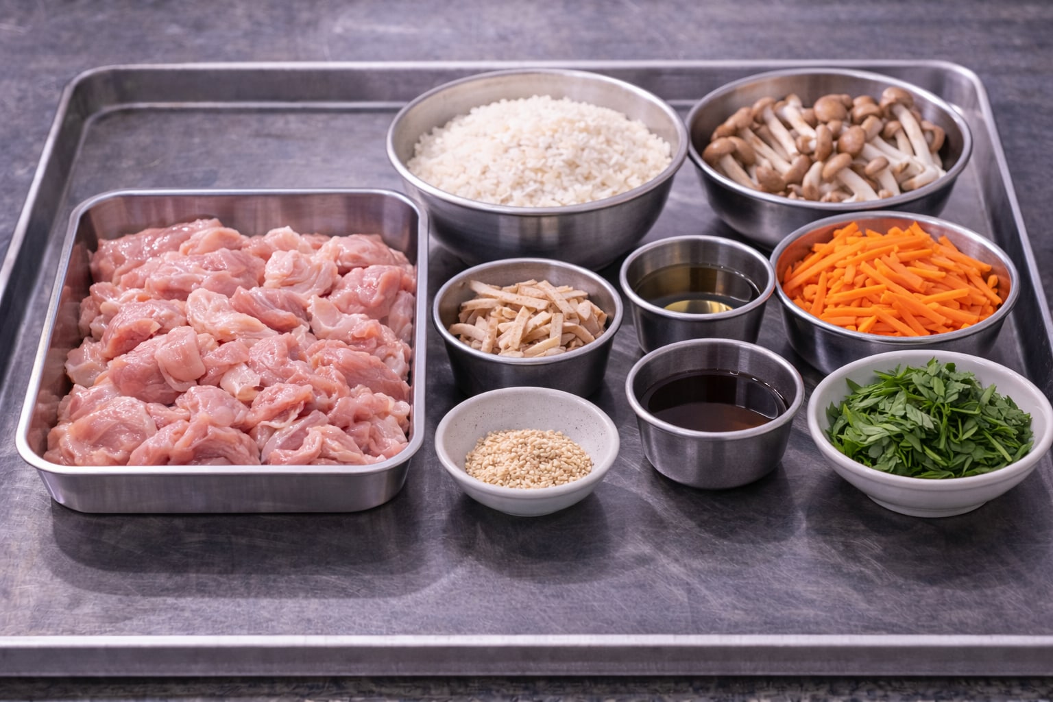 鶏は控えめに入っているが、役割は大きい。もも肉の脂がだしに溶け、全体のコクの核になっている。入れ過ぎれば重くなるが、今日はちょうどいい。噛むと鶏の甘みが出て、米の旨みと混ざる。きのこは二種類以上だろう。しめじの旨み、舞茸の香り。方向の違う香りが重なると、同じ一口でも飽きない。えのきの甘みが入っていると、さらに丸くなる。
