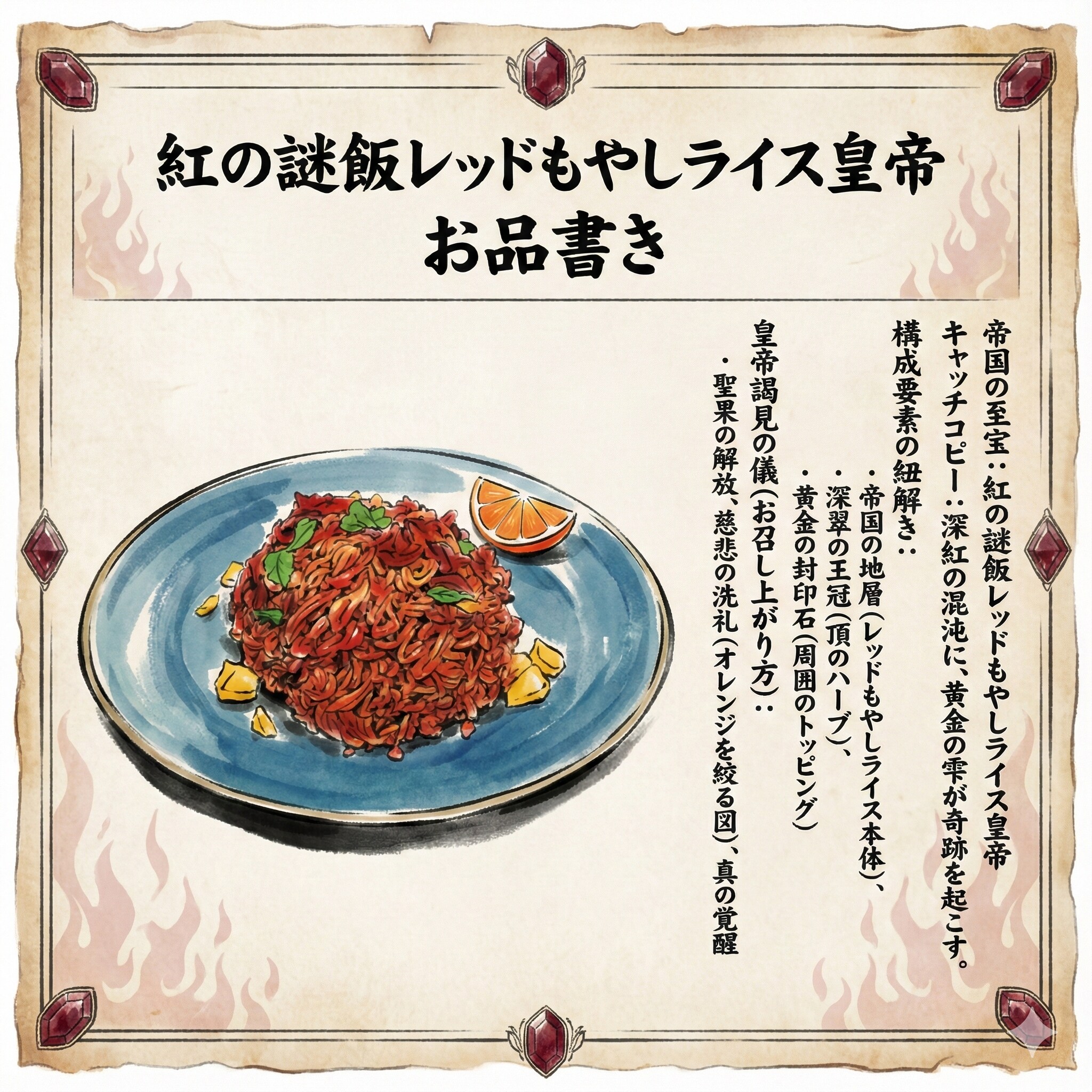 🦊「ほう……。これがGARNET界から参上したという『紅の謎飯レッドもやしライス皇帝』か。 眼前にそびえ立つ、この禍々しくも美しい赤の山脈。 ただの“もやしライス”ではない。漂う風格が、まさしく皇帝のそれだ。 立ち上る湯気からは、濃厚なソースと、未知のスパイスの香りが渦を巻いて押し寄せてくる。 私の胃袋は、もう降伏寸前だ。」