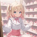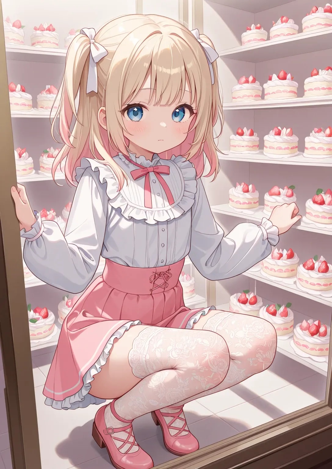 ケーキ屋さんでケース内に並ぶ可愛いケーキを、しゃがんで選んでいる可愛い量産型妹ロリちゃん。