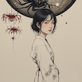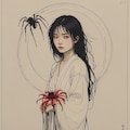 illustration, 1girl, young Japanese woman, long black hair, black wings, surrounded by red spider lilies,