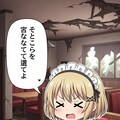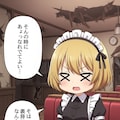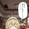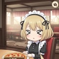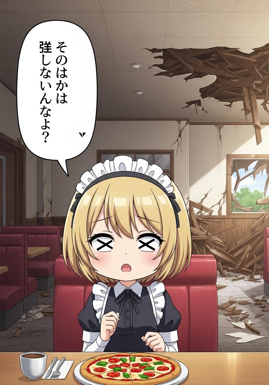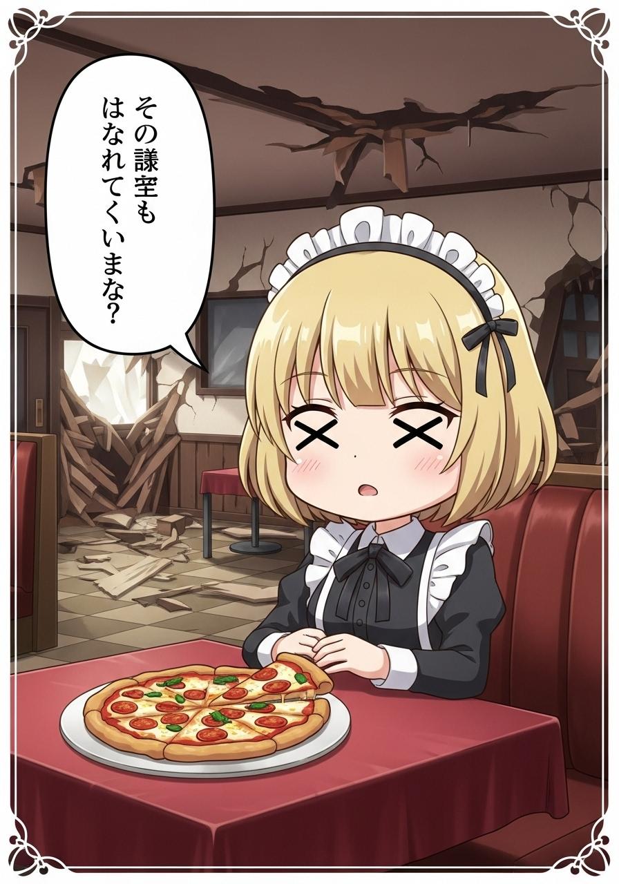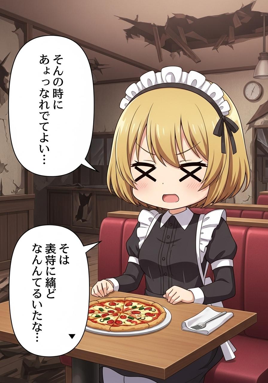 終末のレストランでピザを前に何かを喋るメイドちゃん