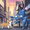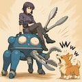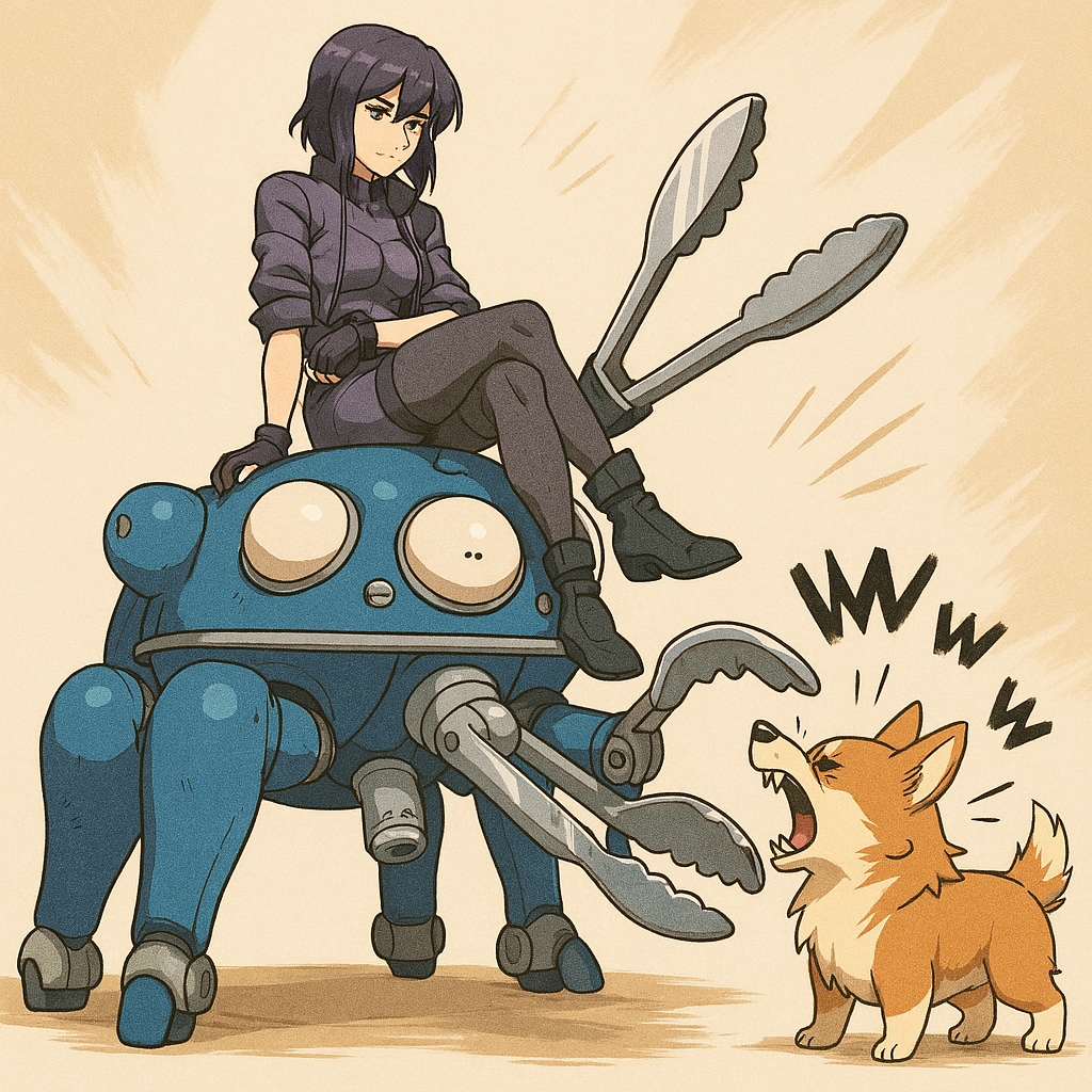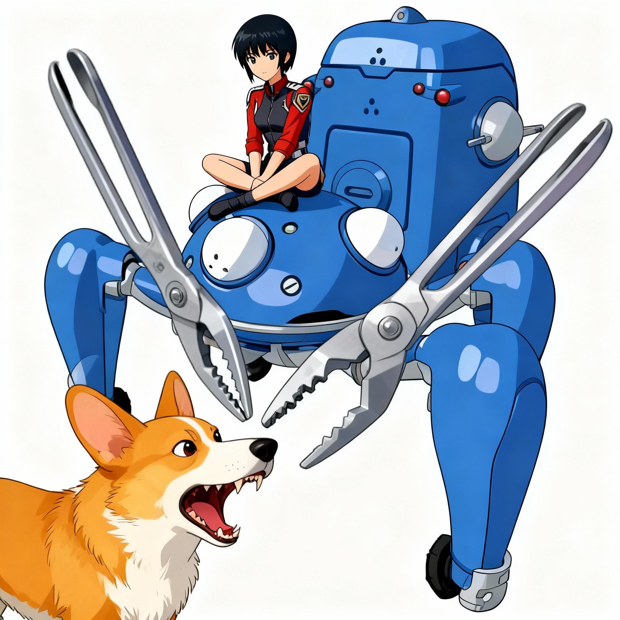 トング仕様のタチコマはカチカチ我慢。草薙素子が座っている。コーギーに吠えられる
