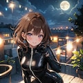 髪の色を茶髪に、衣装を黒のボディスーツ(latex front zipper bodysuit)に変更してください。生成する画像は添付した画像の塗り・画風・スタイルを忠実に再現すること。