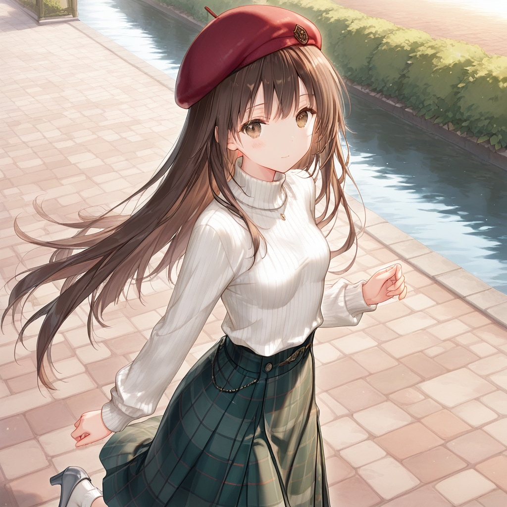 今回の衣装は、ベレー帽 (ダークレッド)、ハイネックセーター (ホワイト)、タータンスカート (ダークグリーン)、ソックス (ホワイト)、パンプス (ダークグレー)です。