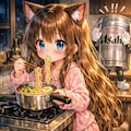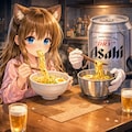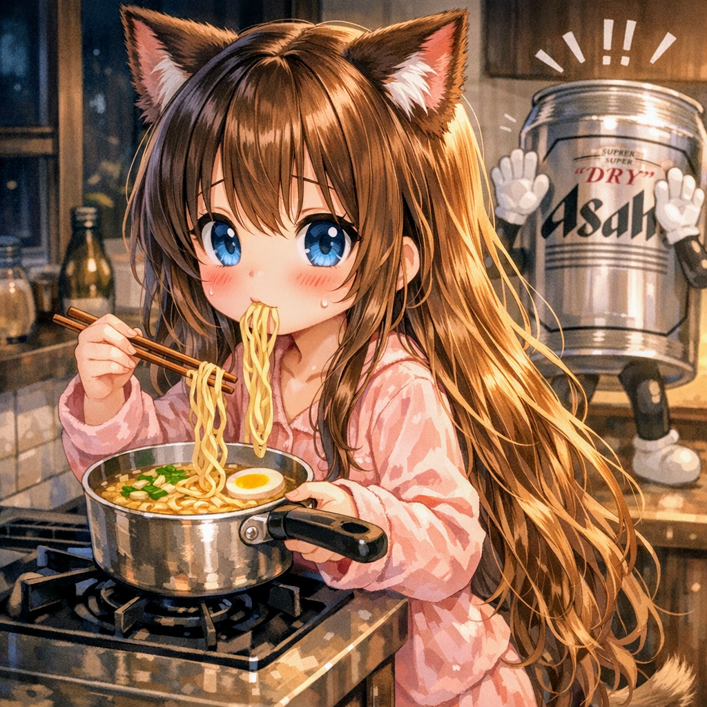 夜にラーメンをこっそり食べる小さな女の子