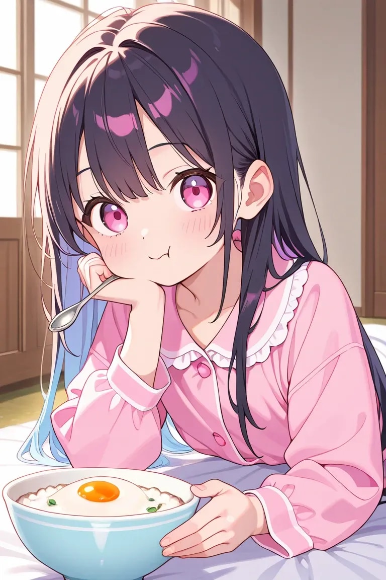 ⑨⑩茶碗によそった卵雑炊をスプーンで食べている、腰まで布団を掛けている、(入れ替え)