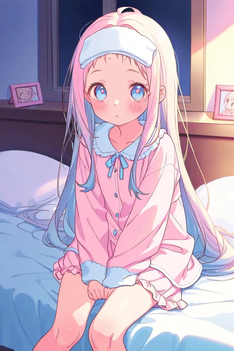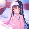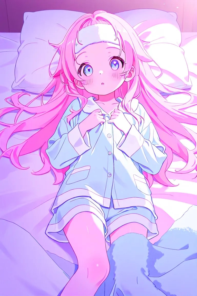 最高傑作、超高解像度、8K、ハイクオリティ、ディテール、日本人、可愛い、キュート、幼い、子供、低年齢、低学年、女児、ストレートロングヘア、量産型ファッション、パジャマ、パステルカラー、ベッドルーム、おでこにタオル、風邪引き、ベッドで寝ている、