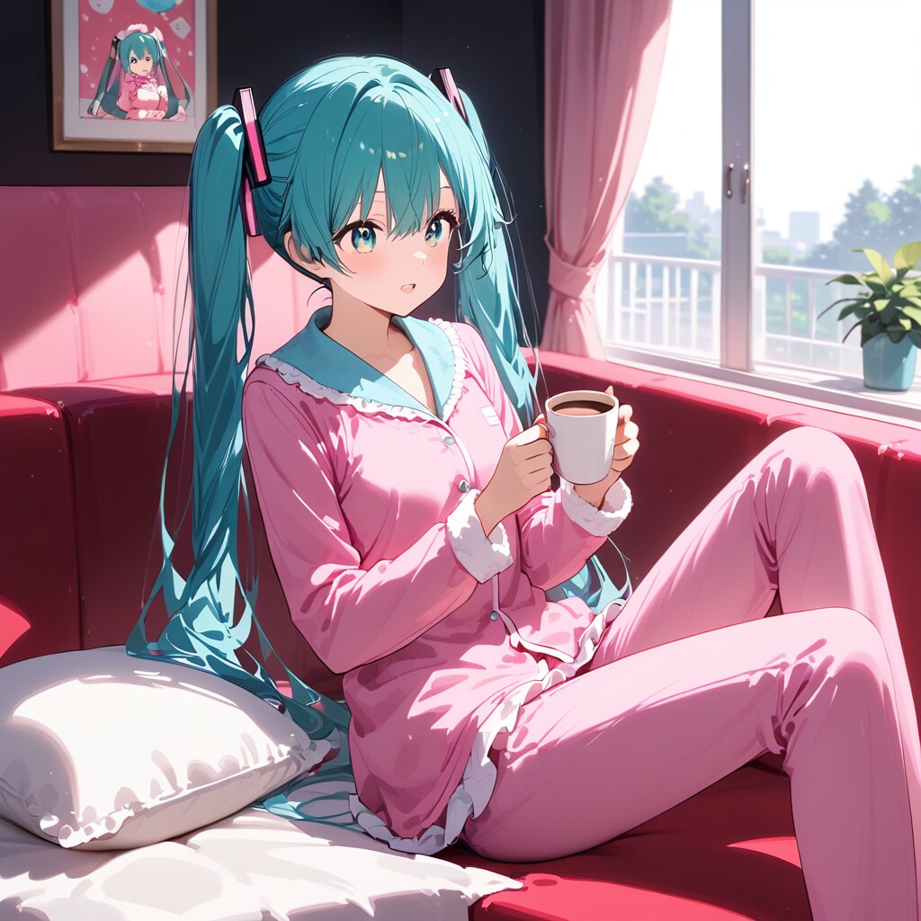 初音ミクがピンクのパジャマを着て、コーヒーカップを持って赤いソファに座っている、オシャレな女の子の部屋