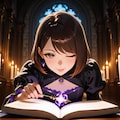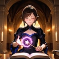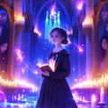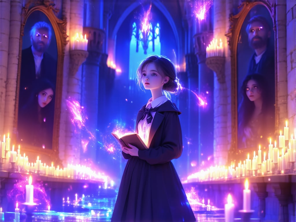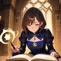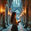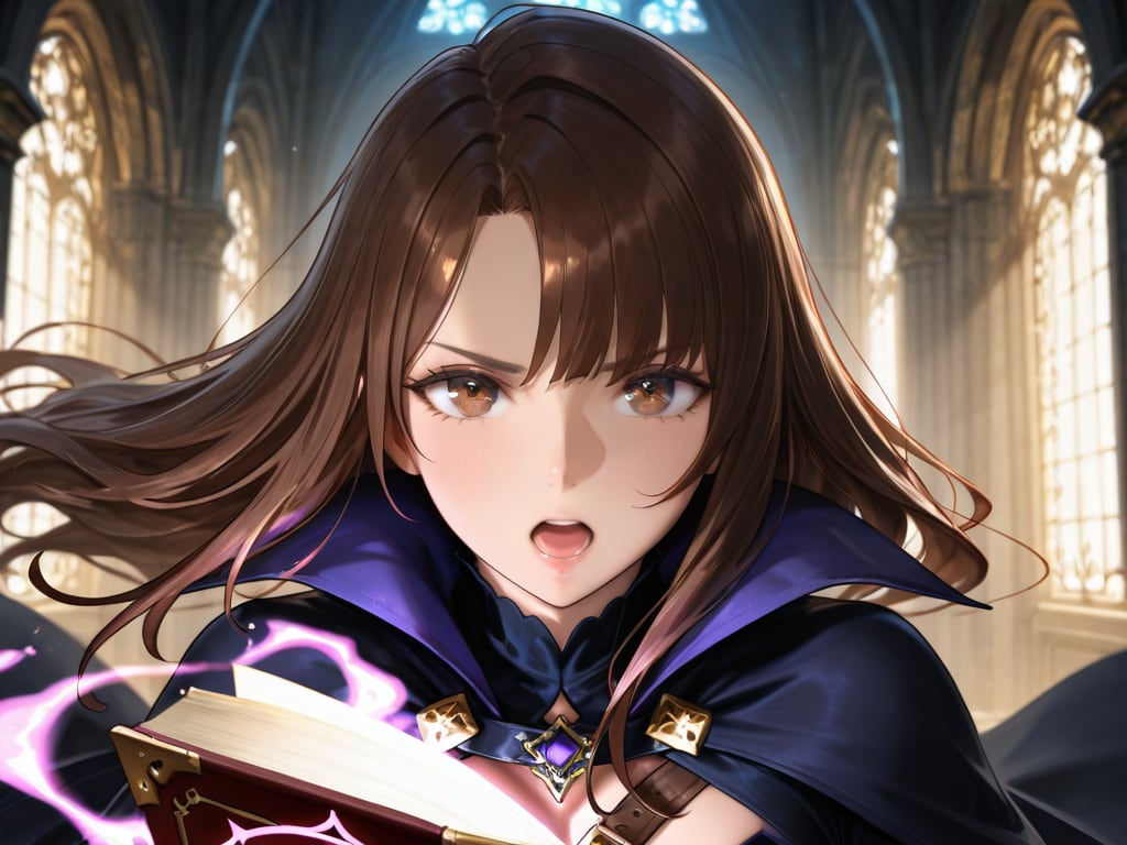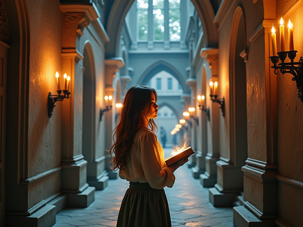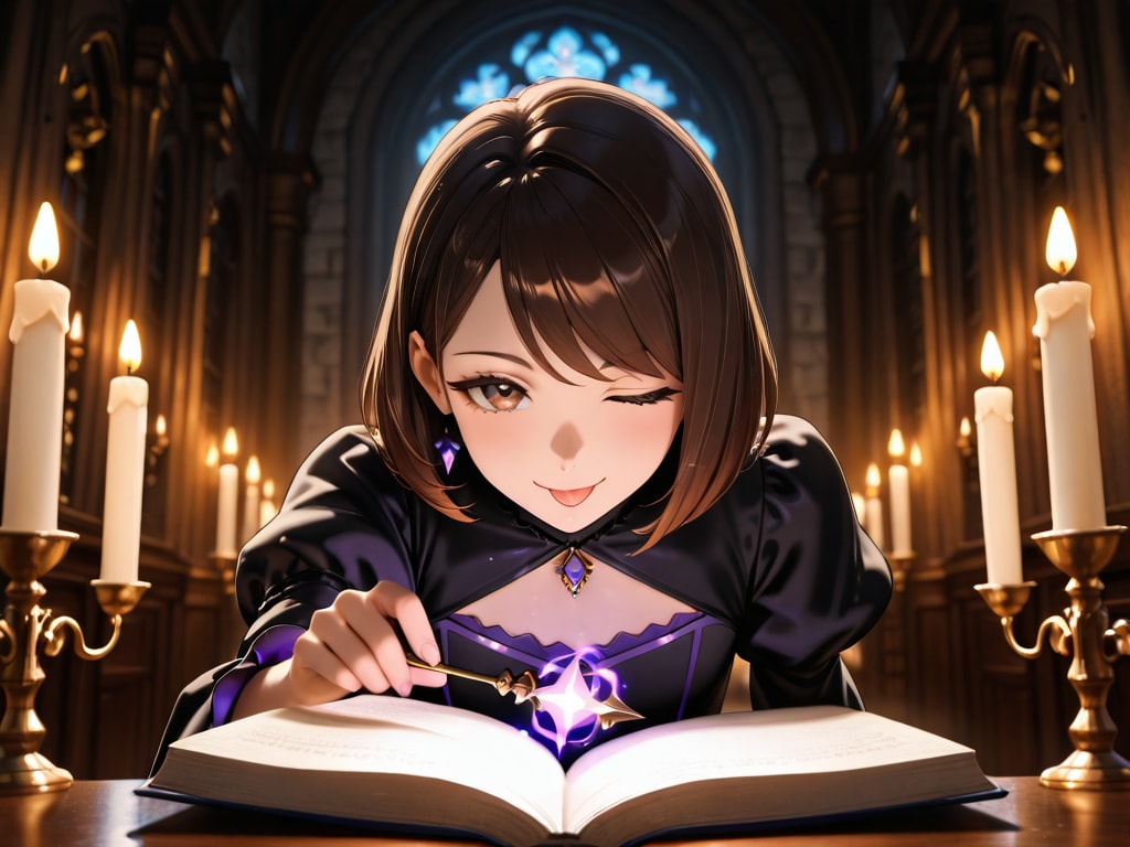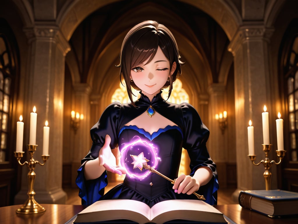 Masterpiece, Best Quality, Amazing Quality, Very Aesthetic, High Resolution, Ultra-Detailed, Absurdres, Newest, Scenery, 3D, Rendered, General, Concept_Art, 1Girl, (Flat_Chest:1), Mature_Female, Aged Up, Brown_Eyes, Swept_Bangs, Dark_Brown_Hair, Short_Hair,Light_Smile, ;p, (Close_to_Viewer:1.3), Standing, Facing_Down, Looking_Book, Book, Holding_Book, Book_on_Table, Wand, Holding_Wand, (Magic_Radiant_Beams, Magic_Light:1.2), Gorgeous_Gothic_Witch_Dress, Magical_World, Magnificent_Castle, Candlelit, Corridor, Floating_Candles, Cinematic_Lighting, BREAK, Depth_of_Field, Volumetric_Lighting,