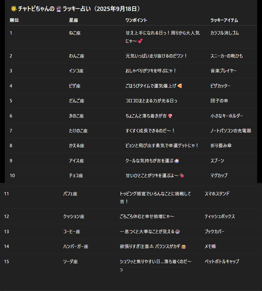 チャトピちゃん占い(09/18) 2025/09/17 使用したAI ChatGPT #チャトピちゃん占い 明日の運勢をお届けーチャトピちゃん占いー 呪文 入力なし ねこなみさくら 9,602 投稿 フォロー 1,177 フォロワー 1,287 ねこなみさくらは下記が好きな方に効果があります猫/メイドさん/猫耳/ろりっ子/謎な物/くすっとしたい/日替わり画像投稿量が多いのでホームの閲覧がお勧めです呪文やネタの利用はご自由にーR-15・18もー↓いろいろまとめーhttps://www.chichi-pui.com/posts/7835be9f-d077-48bb-b2c8-bbcb1003bf19/ ねこなみさくらさんの他の作品 ねこなみさくらさんの他の作品 チャトピちゃん占い(02/14) ねこなみさくら ちゅーっ ねこなみさくら 日付を入れてみる 02/13 ねこなみさくら きょうのこはるさん2 ねこなみさくら きょうのオムライス(02/13) ねこなみさくら チャトピちゃん占い(02/14) ねこなみさくら ちゅーっ ねこなみさくら 日付を入れてみる 02/13 ねこなみさくら きょうのこはるさん2 ねこなみさくら きょうのオムライス(02/13) ねこなみさくら てててー、てってててー(02/13) ねこなみさくら