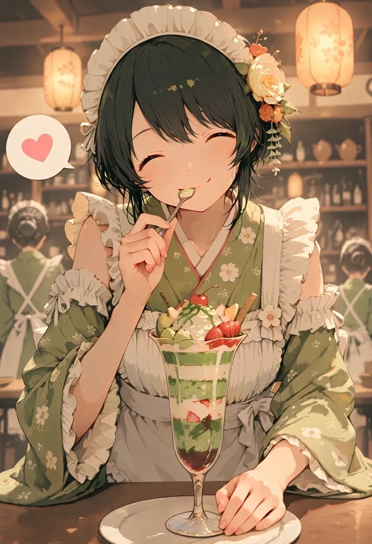 4~5枚目は休憩時間にまかないのパフェを食べてご満悦の場面😊