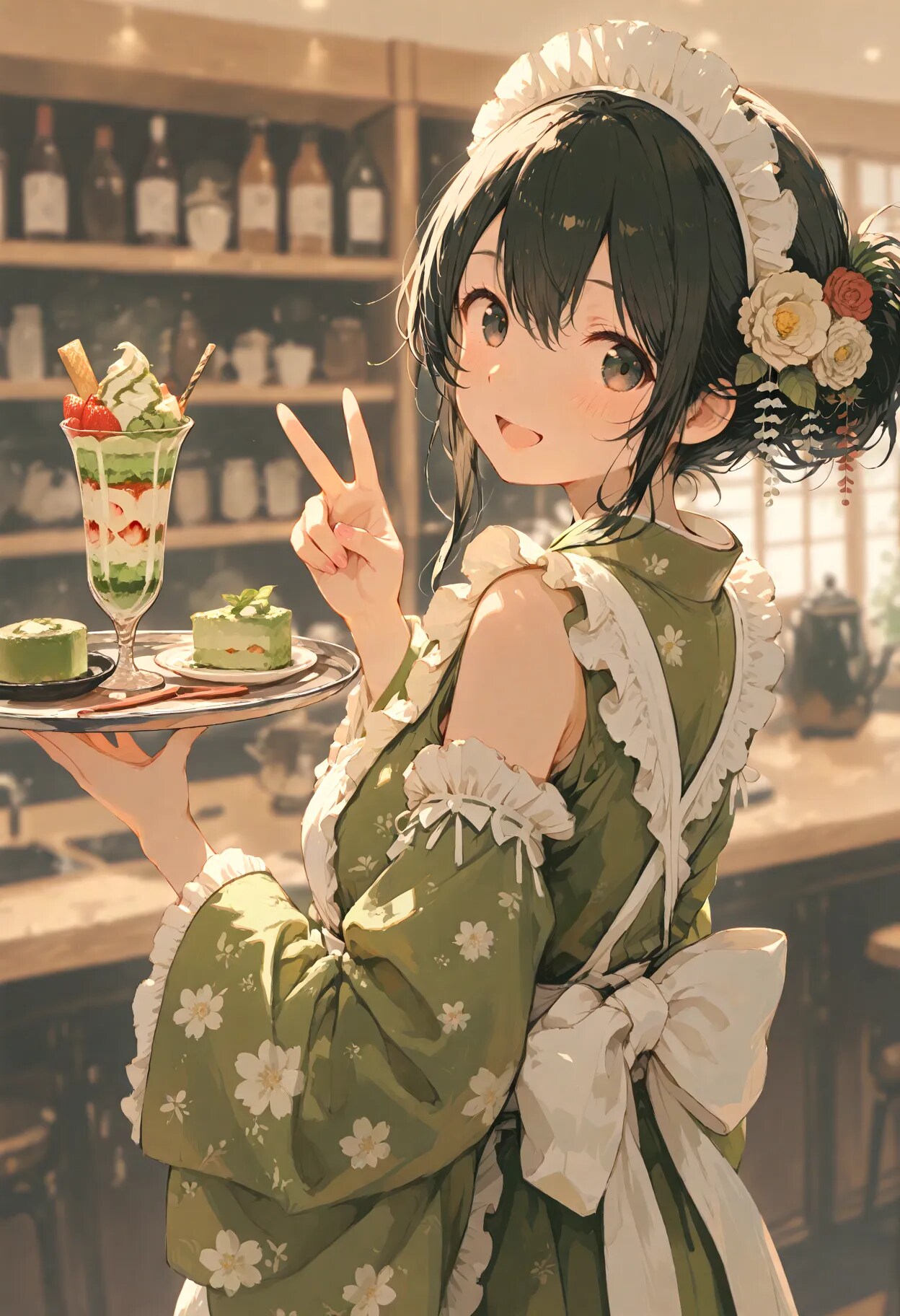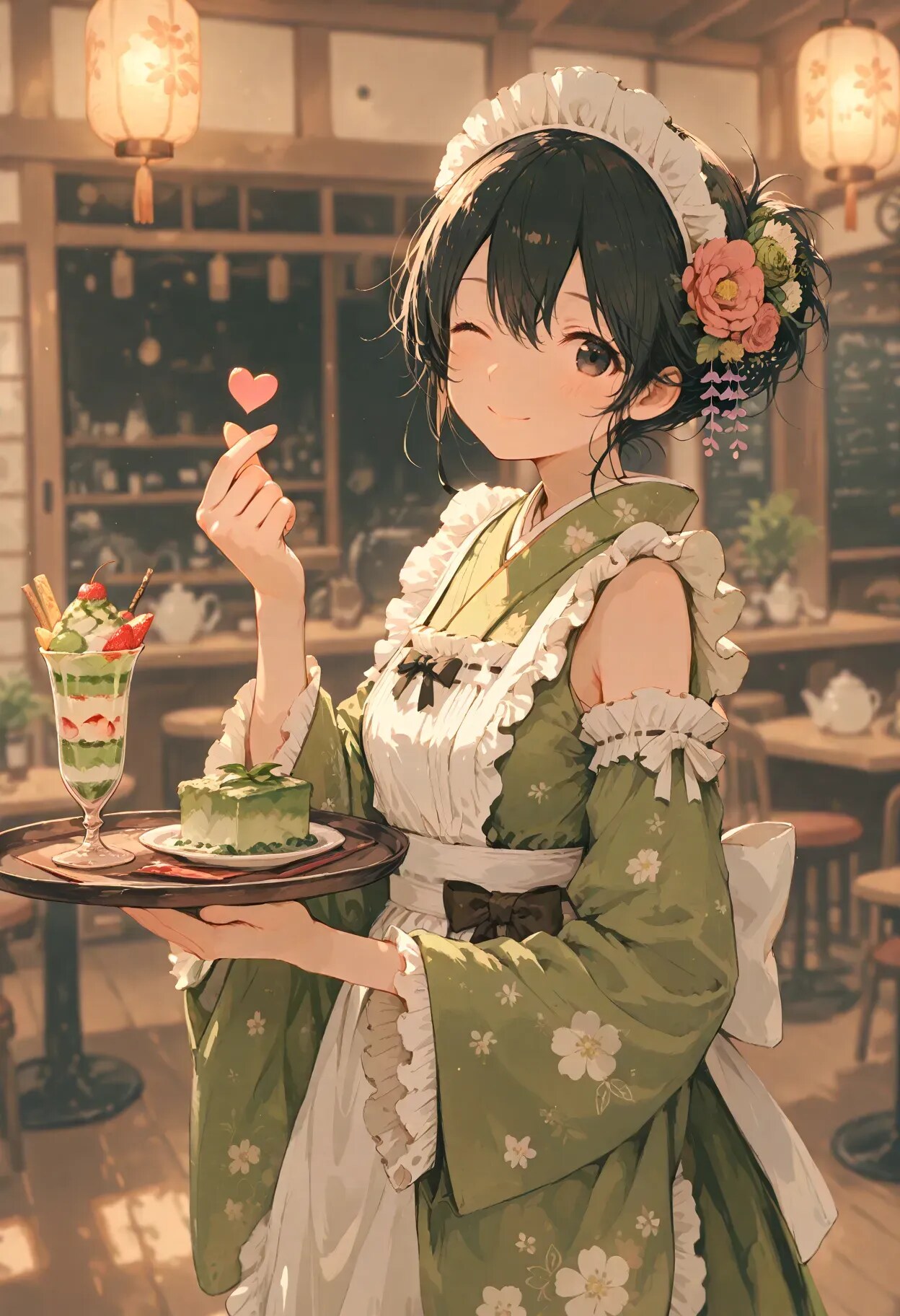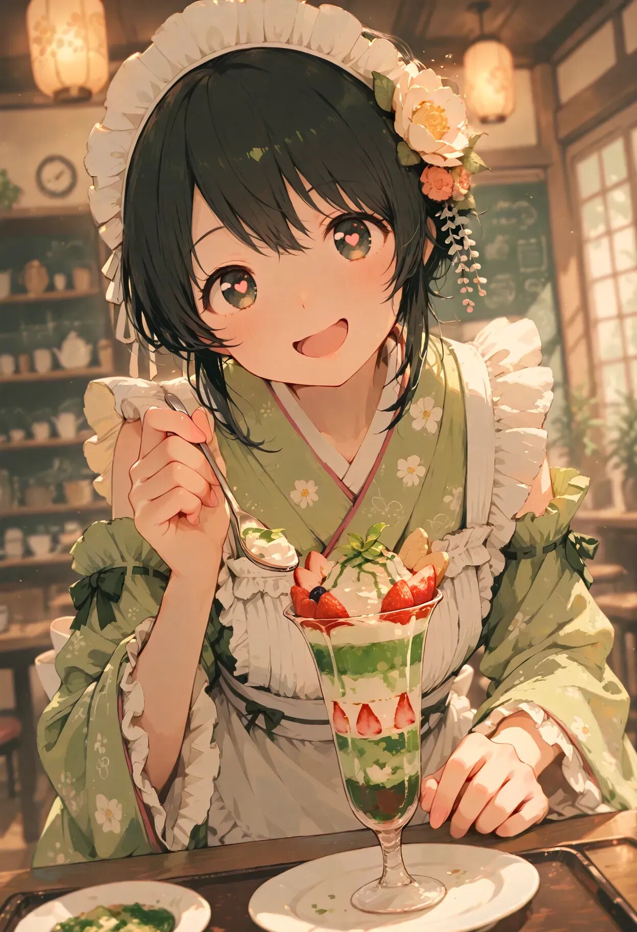 抹茶フェアの期間中は当店のコスチュームも抹茶色の特別仕様となっております♪