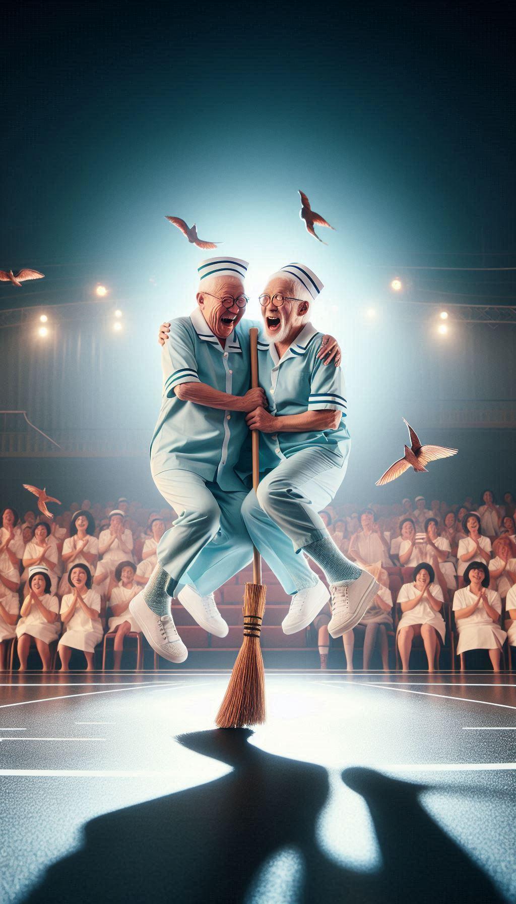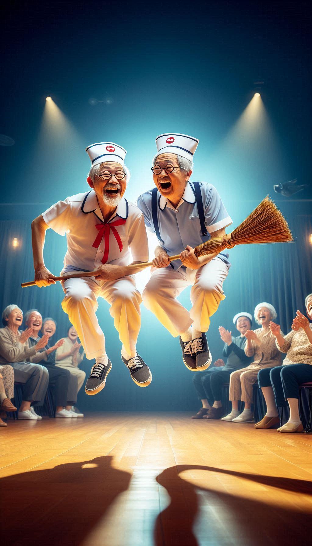 箒にまたがって空を飛んでいるように見せる、タネも仕掛けもない漫談が鉄板ネタ。