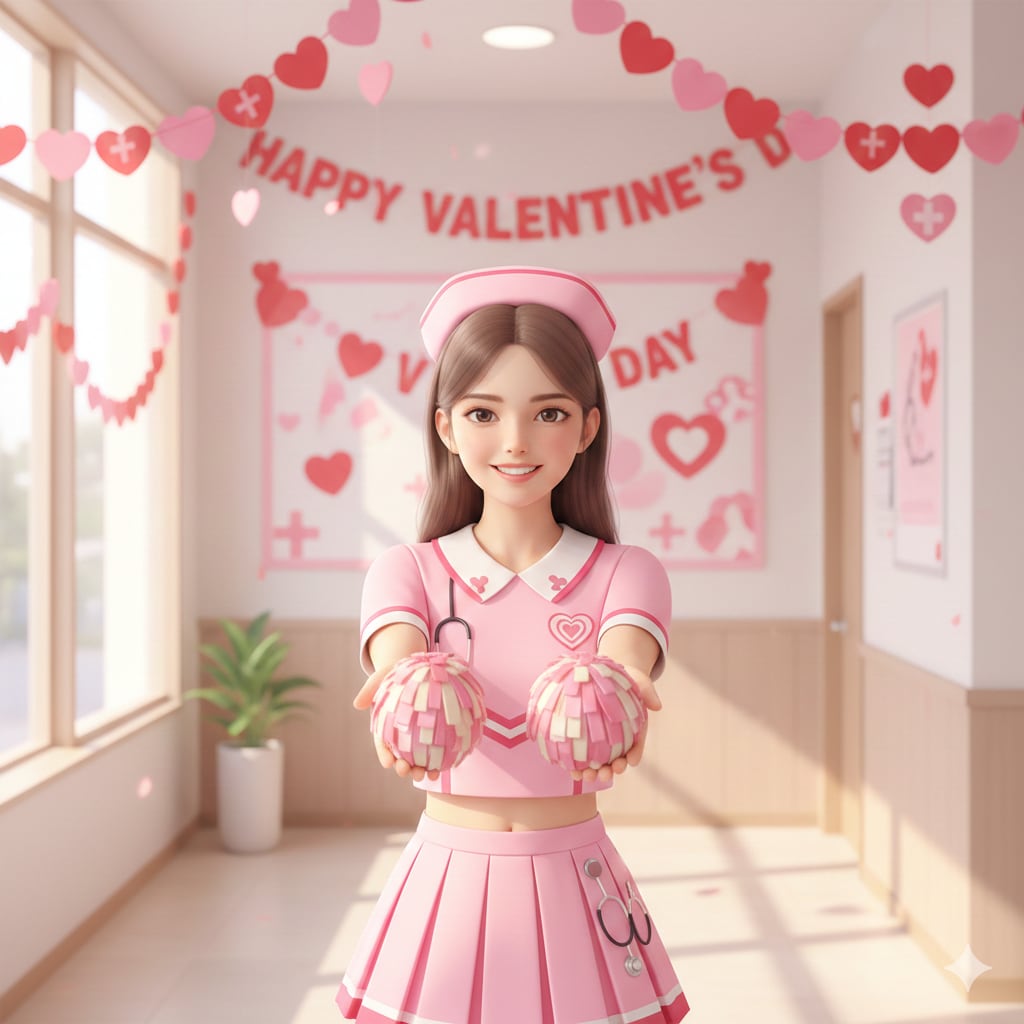 ピンクと白のチョコでできたポンポンの形の酒入りチョコ・ボンボンをプレゼントするチア衣装ナース