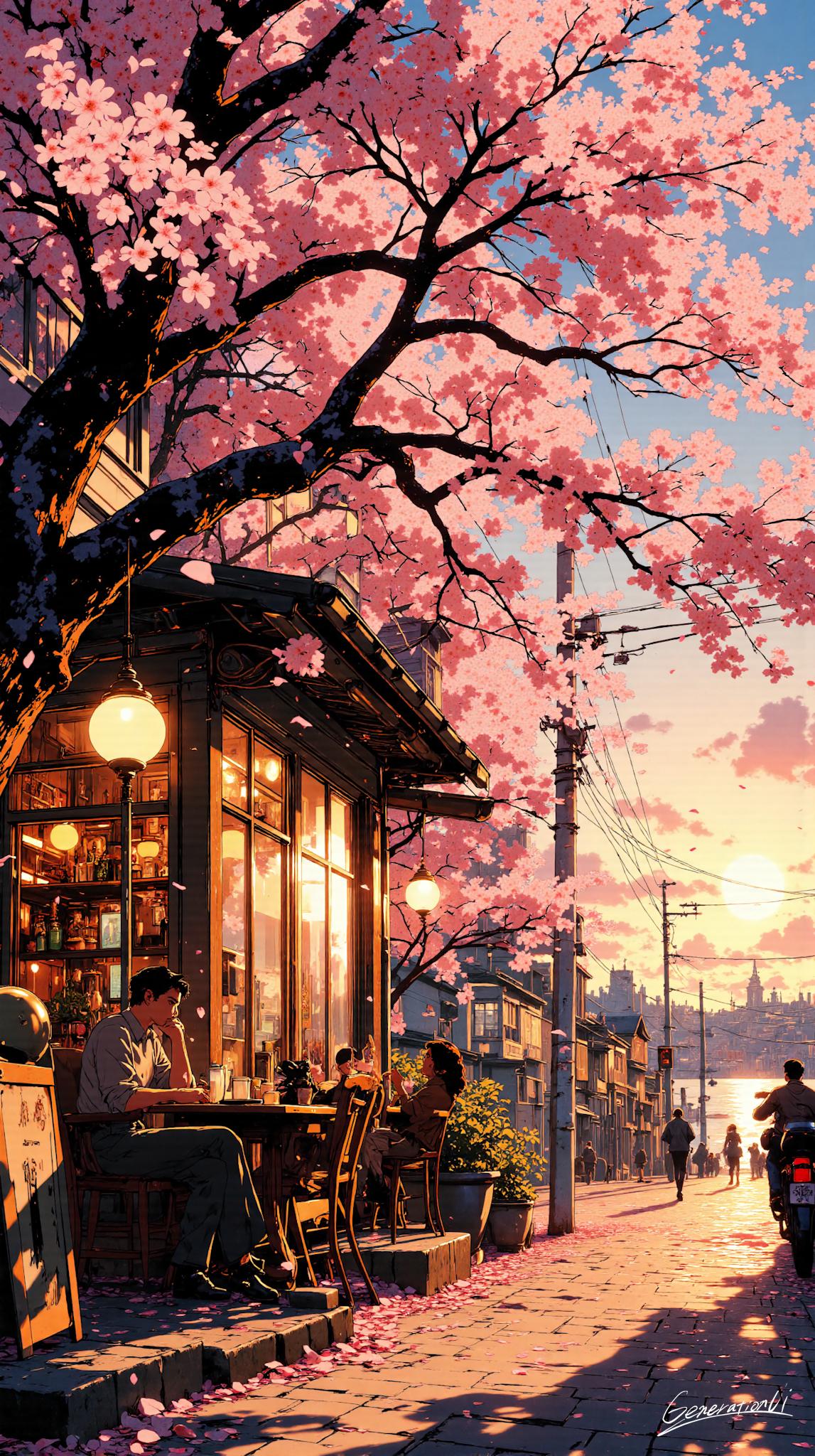 夕暮れのカフェテラス、遠くには海が見える。通りには人々が行き交い、桜が舞い散る・・。こんな景色、日本のどこかにきっとあるんじゃないでしょうか。もしよければスマホの壁紙にしてください。コメント欄で教えてくれたら嬉しいです。このイラストにまつわる短い物語もご堪能ください。
