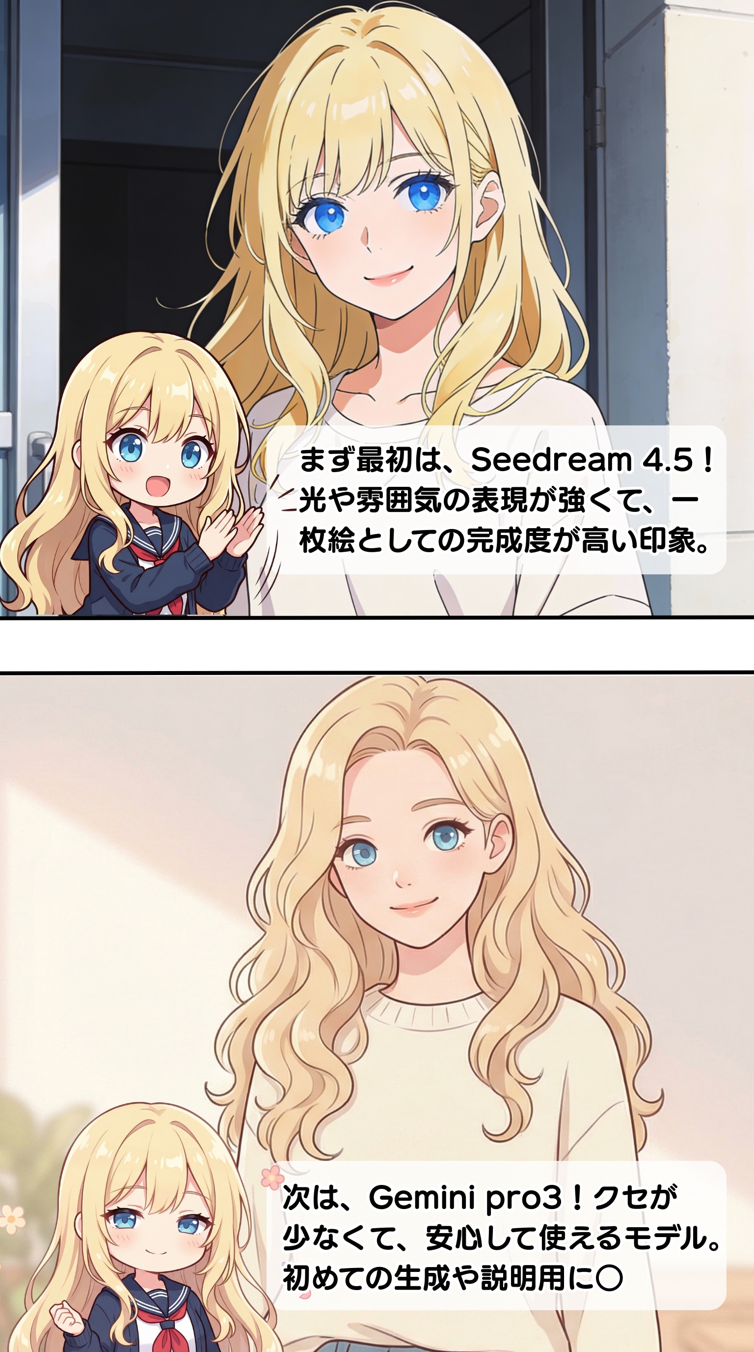 簡単な指定で同じプロンプトを使用して、比較してみたよ~。