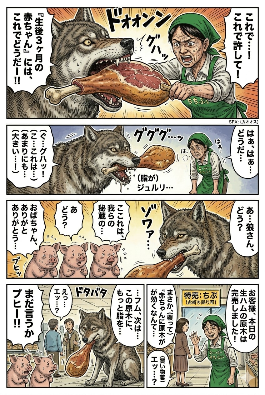 一瞬4匹に増えていますが、彼がソーセージや生ハムになってしまったのでしょうか