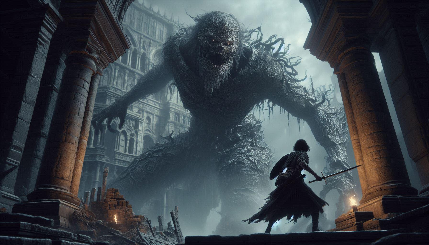 ソウルライクと言われるジャンル、いわゆる死にゲーで初見ボスと戦う時、大抵ムービーとかが入ってかっこよく挑む描写から始まるのに・・?(今回、投稿したイラストはそんな一場面のイメージです)。