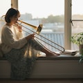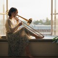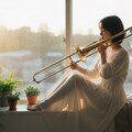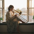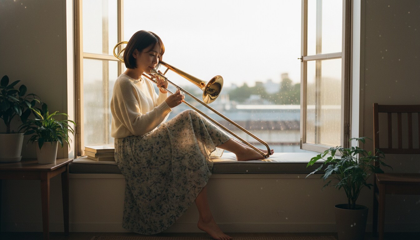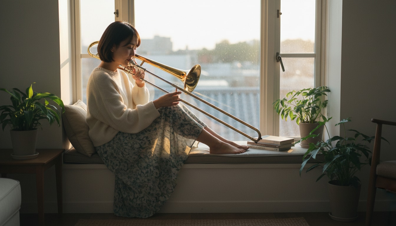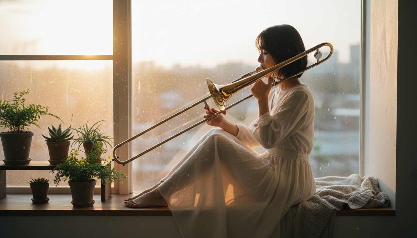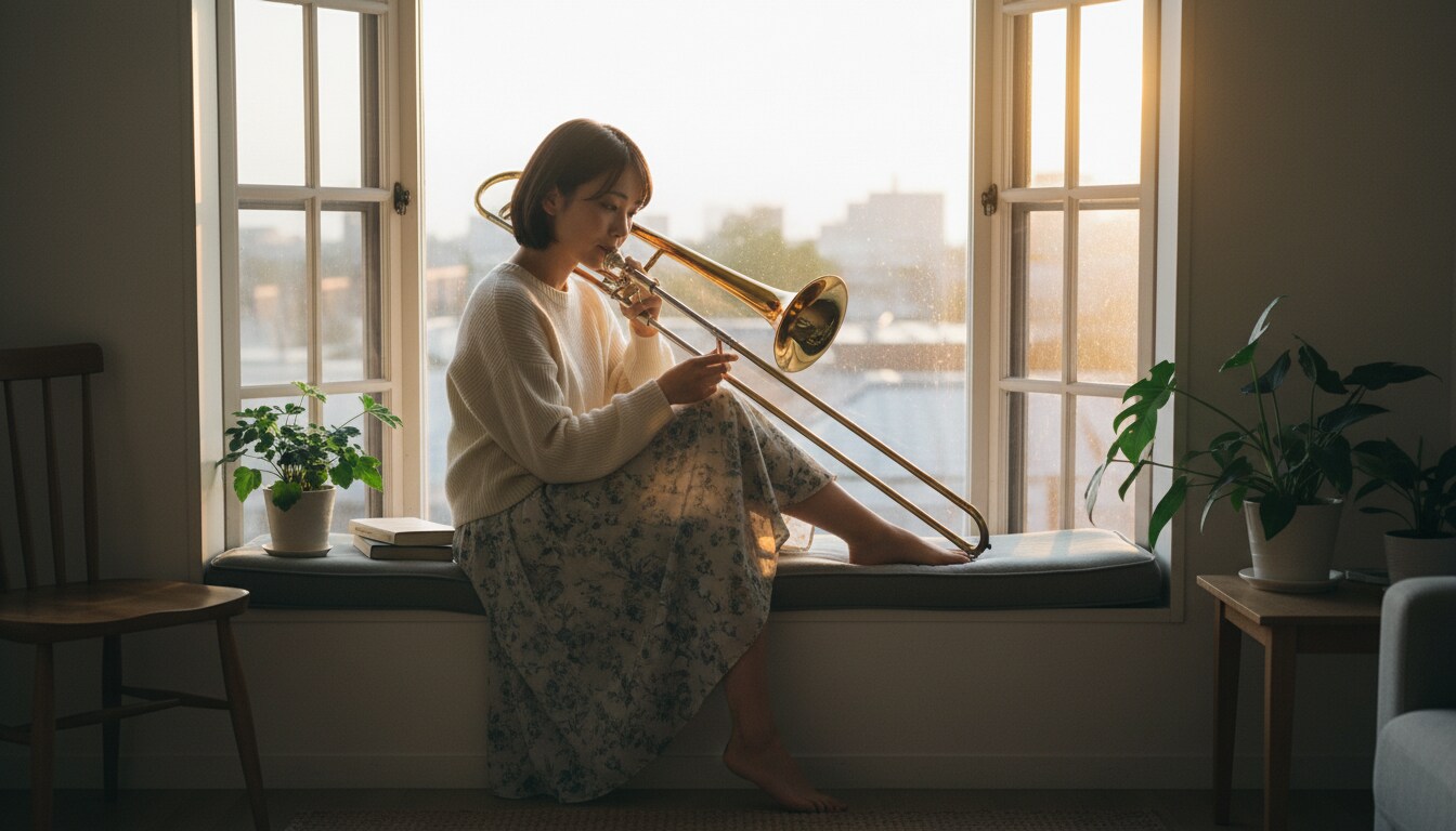 「夕陽が部屋いっぱいに広がる時間。トロンボーンの音色が、光に溶けていく。言葉にならない感情が、音楽になって溢れ出す瞬間。 #トロンボーン #夕焼け #音楽のある暮らし #エモい瞬間」