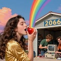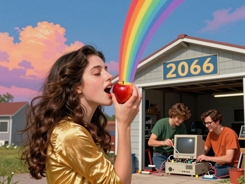 「女性がリンゴを一口噛んだら、噛み口から7色の虹が出て来た。目の前のガレージでは2人の貧乏そうな若者が懸命に手作りのマイコンを作っていたよ」というシチュエーションです。まあ、色々とコテコテw...