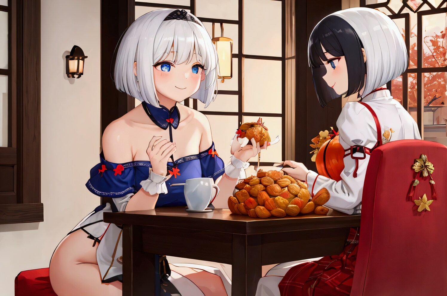 2人のアニメ風キャラクターがテーブルに座っている様子を描いています。部屋は居心地の良い雰囲気で、大きな窓から自然光が差し込んでいます。1人のキャラクターは短い白髪で、青いオフショルダードレスを着ており、赤いアクセントが付いています。もう1人のキャラクターは短い黒髪で、白いブラウスに赤いサスペンダーと赤いスカートを着ています。テーブルの上には大量のペストリーが並べられており、2人は食事を楽しんでいるようです。窓の外には秋の葉が見え、季節感が感じられます。全体的に、暖かく招かれるような雰囲気が漂っています。
