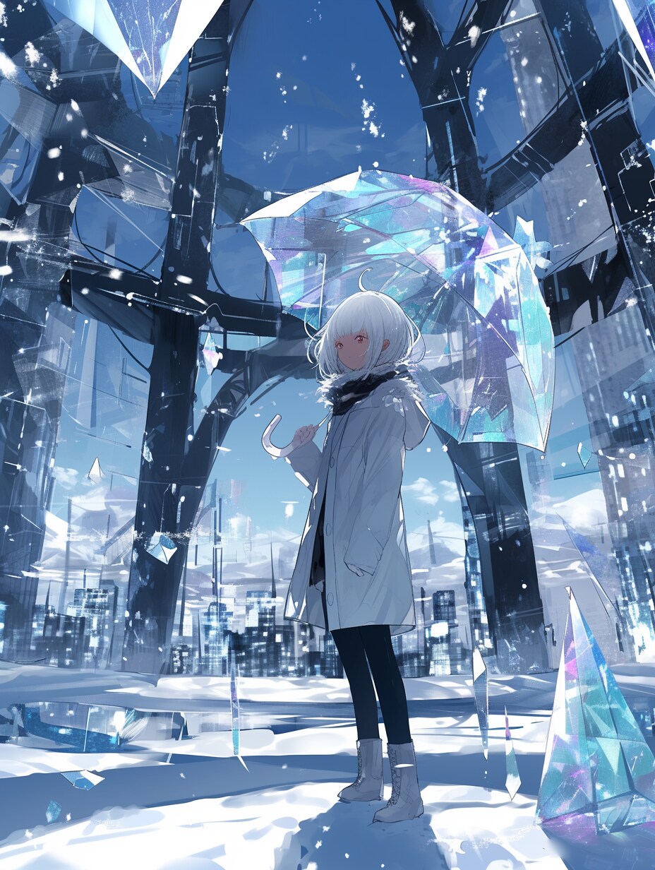 クリスタルの街に差し込む光の中で、彼女は静かに彷徨う。透明なガラスの世界が映し出すのは、冷たくも美しい未来の姿。彼女の心に輝く希望が、この凍てついた都市を温かく照らし出す。