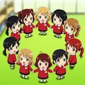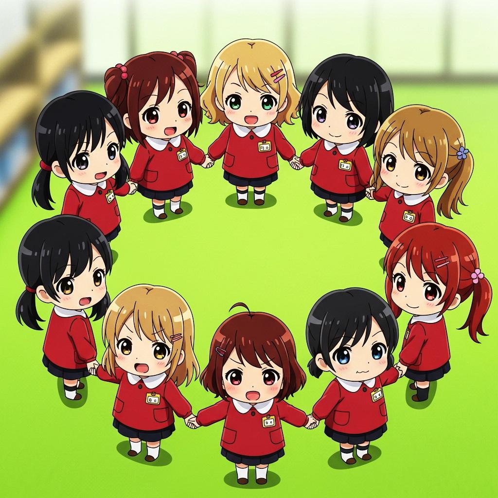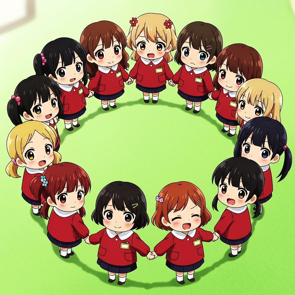 円陣を組んでいる臙脂の園児服を着た園児たち