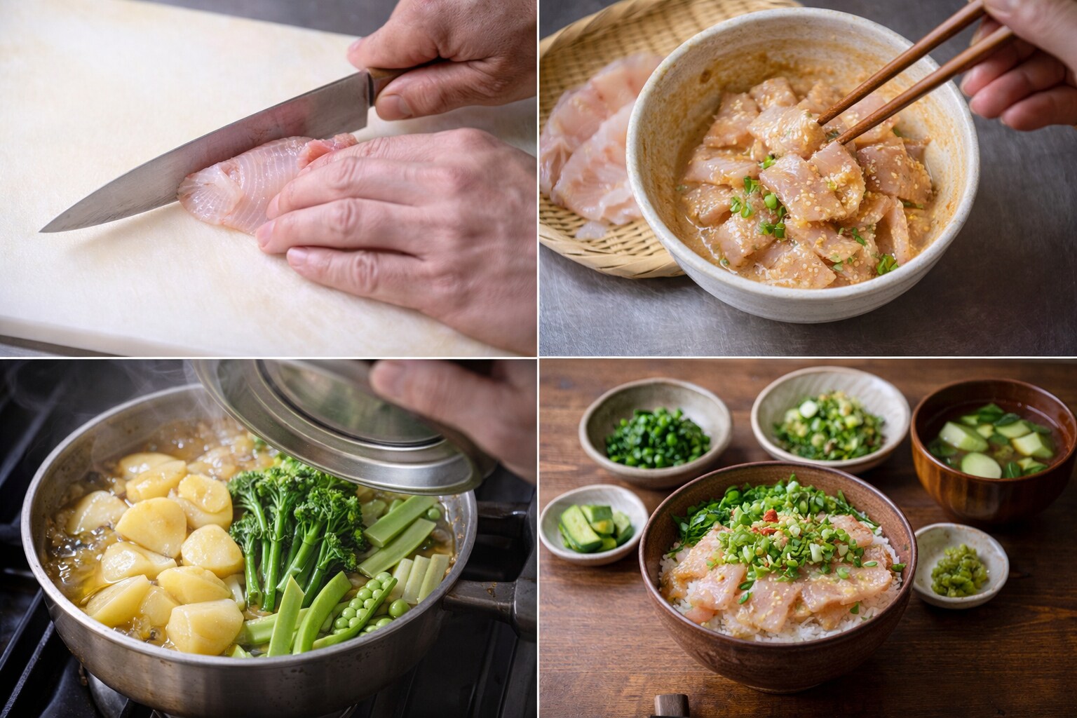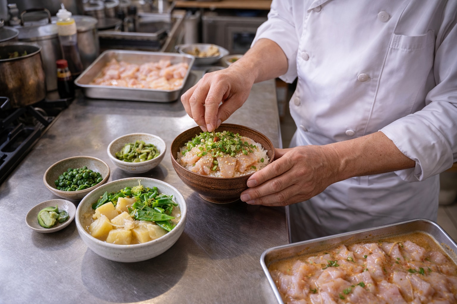 薬味の青みや白ごまの香りが、丼の中に小さな起伏をつくり、食べ進めるたびに印象が少しずつ変わっていく。