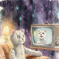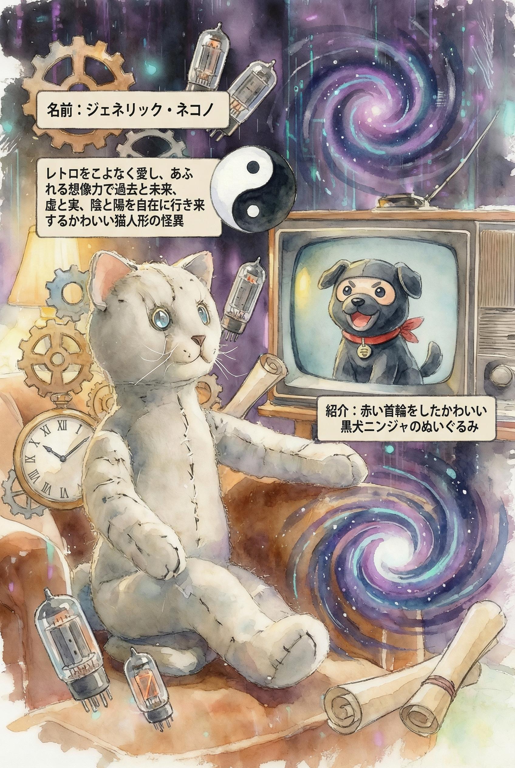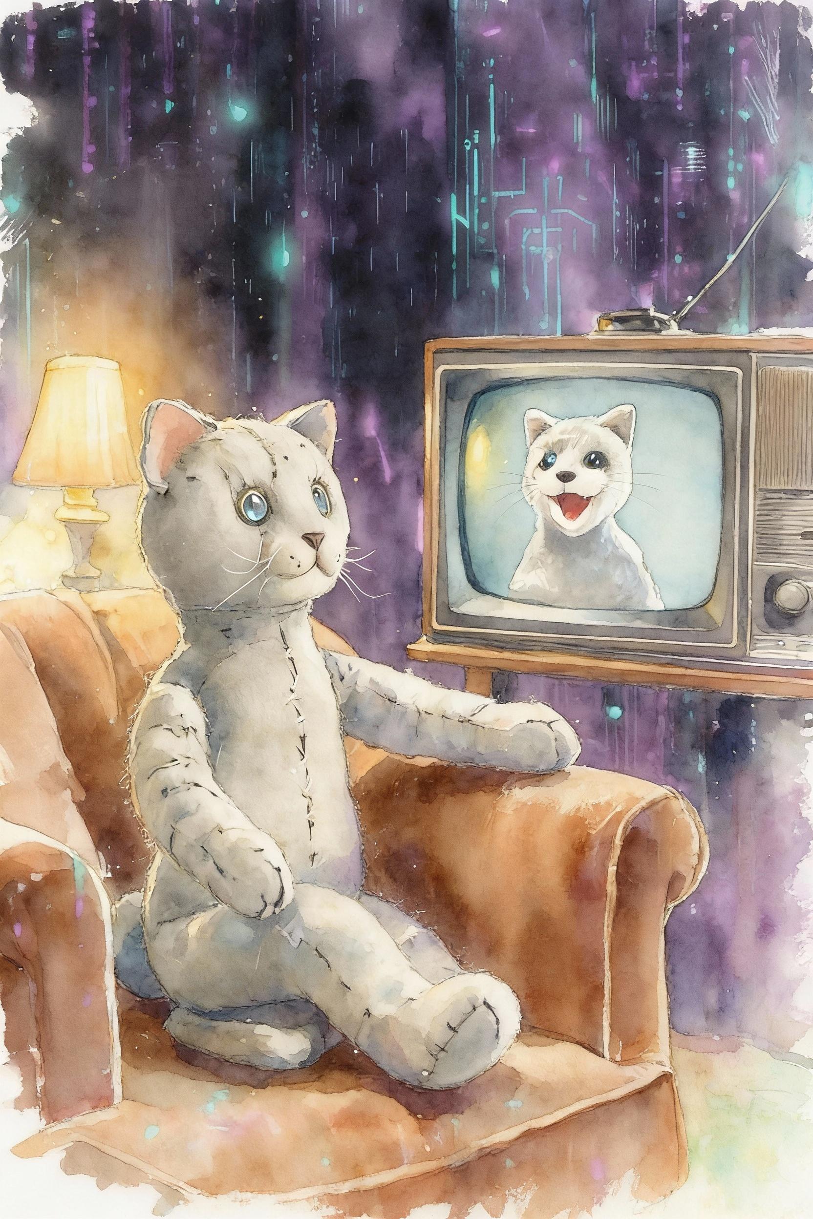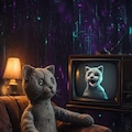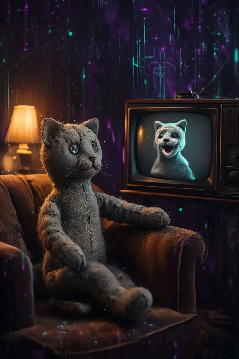 4枚め: 最初にMAI-Image-1で出してもらったもの。プロンプトは「1930s antique grey cat doll is watching retro TV. In TV screen, grey cat puppet is talking. cozy atmosphere. abstract dark cyberpunk background」
