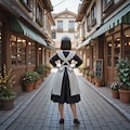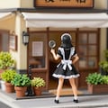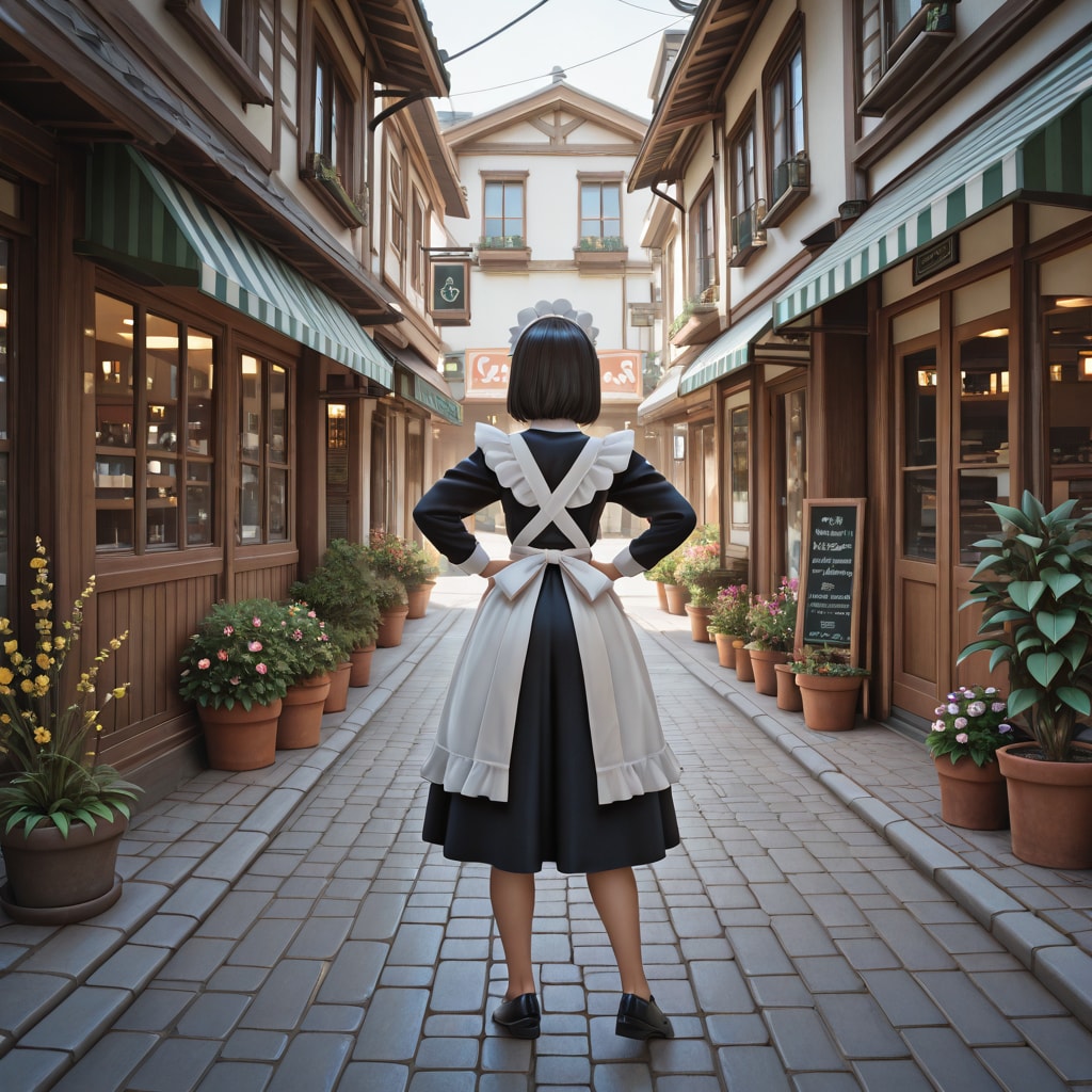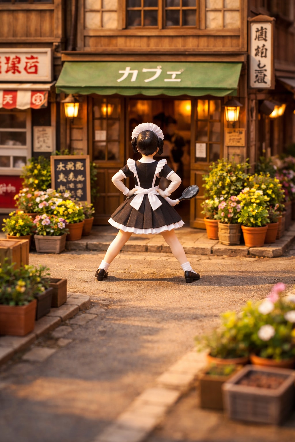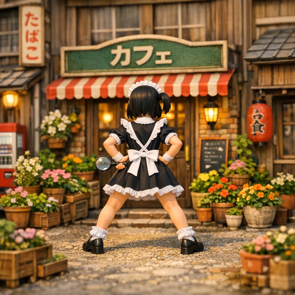masterpiece, best quality, amazing quality, very aesthetic, high resolution, ultra-detailed, absurdres, newest, scenery, 3d, rendered, miniature, diorama, tilt-shift, scale model, retro Japanese street, nostalgic, from behind, full body, wide shot, 1girl, holding magnifying glass, maid, classic maid uniform, apron, white headdress, shoes, holding magnifying glass, black hair, short hair, nio-dachi, back shot, standing, hands on hips, feet apart, japanese storefront, retro cafe, wooden building, many flower pots, planters, potted plants, greenery, shoppage signs, cobblestone street, sunny day, warm lighting, cinematic_lighting, BREAK, depth_of_field, volumetric_lighting,