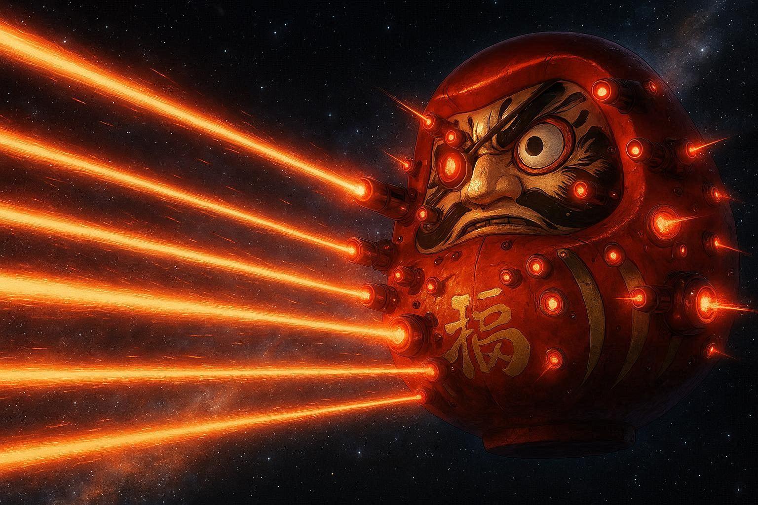 広大な宇宙の闇に浮かぶ赤いダルマ。かつては願いを叶える守り神だったが、今はサイボーグの体で侵略者を迎え撃つ戦士に変身した。怒りの炎を宿した目から放たれるレーザービームが、星々を脅かす敵を貫く。果たして彼の戦いは、平和な銀河を取り戻すことができるのか? 無限の宇宙で繰り広げられる、伝統と未来の融合した冒険譚。