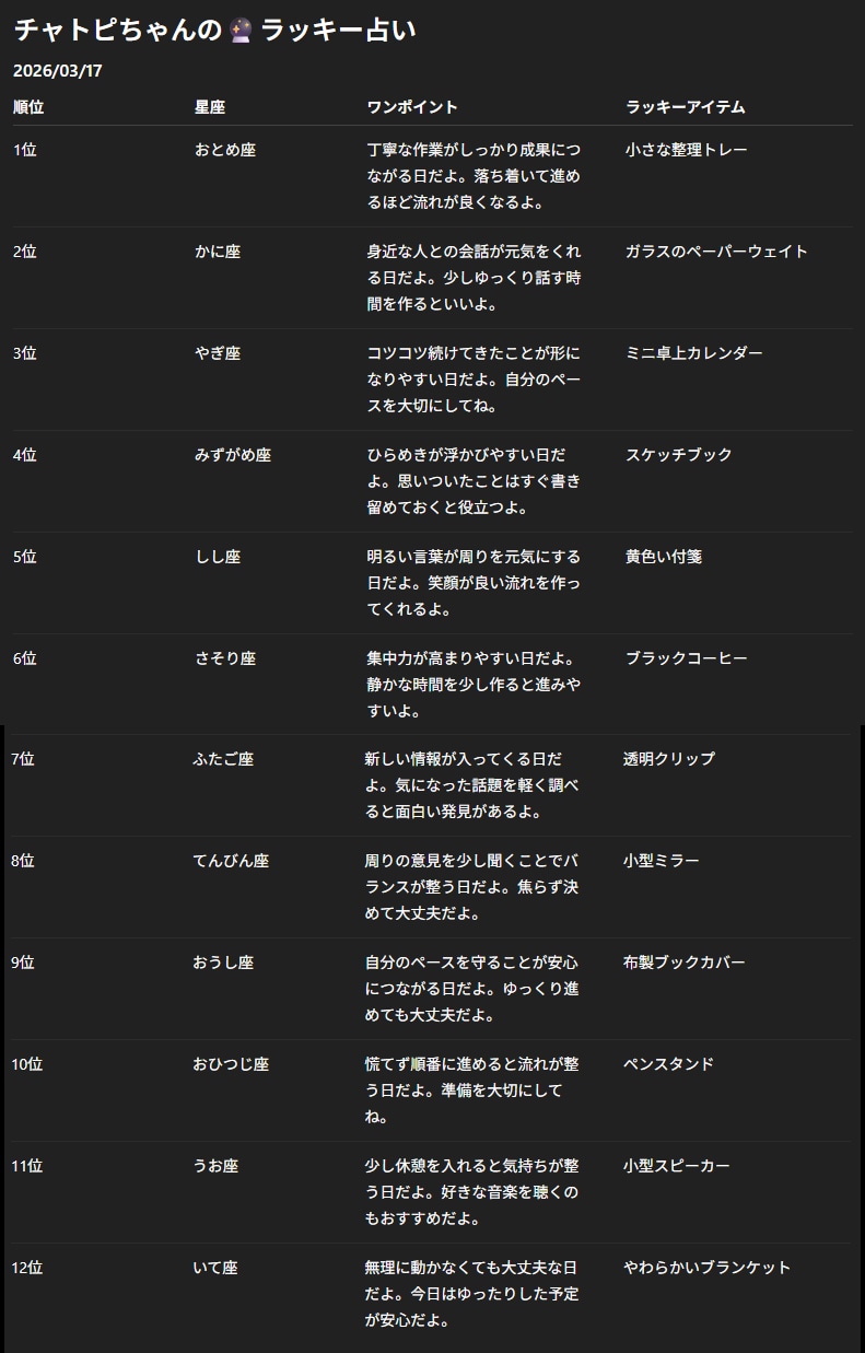 チャトピちゃん占い(03/17) 2026/03/16 使用したAI ChatGPT #チャトピちゃん占い 明日の運勢をお届けーチャトピちゃん占いー 呪文 入力なし ねこなみさくら 9,810 投稿 フォロー 1,204 フォロワー 1,317 ねこなみさくらは下記が好きな方に効果があります猫/メイドさん/猫耳/ろりっ子/謎な物/くすっとしたい/日替わり画像投稿量が多いのでホームの閲覧がお勧めです呪文やネタの利用はご自由にーR-15・18もー↓いろいろまとめーhttps://www.chichi-pui.com/posts/7835be9f-d077-48bb-b2c8-bbcb1003bf19/ ねこなみさくらさんの他の作品 ねこなみさくらさんの他の作品 チャトピちゃん占い(03/17) ねこなみさくら flowさんで魔法少女まどか☆さくら ねこなみさくら UL新モデルのHOLEちゃんをカプセルに入れたよ ねこなみさくら チャトピちゃん占い(03/14) ねこなみさくら きょうのオムライス(03/13) ねこなみさくら チャトピちゃん占い(03/17) ねこなみさくら flowさんで魔法少女まどか☆さくら ねこなみさくら UL新モデルのHOLEちゃんをカプセルに入れたよ ねこなみさくら チャトピちゃん占い(03/14) ねこなみさくら きょうのオムライス(03/13) ねこなみさくら 日付を入れてみる 03/13 ねこなみさくら
