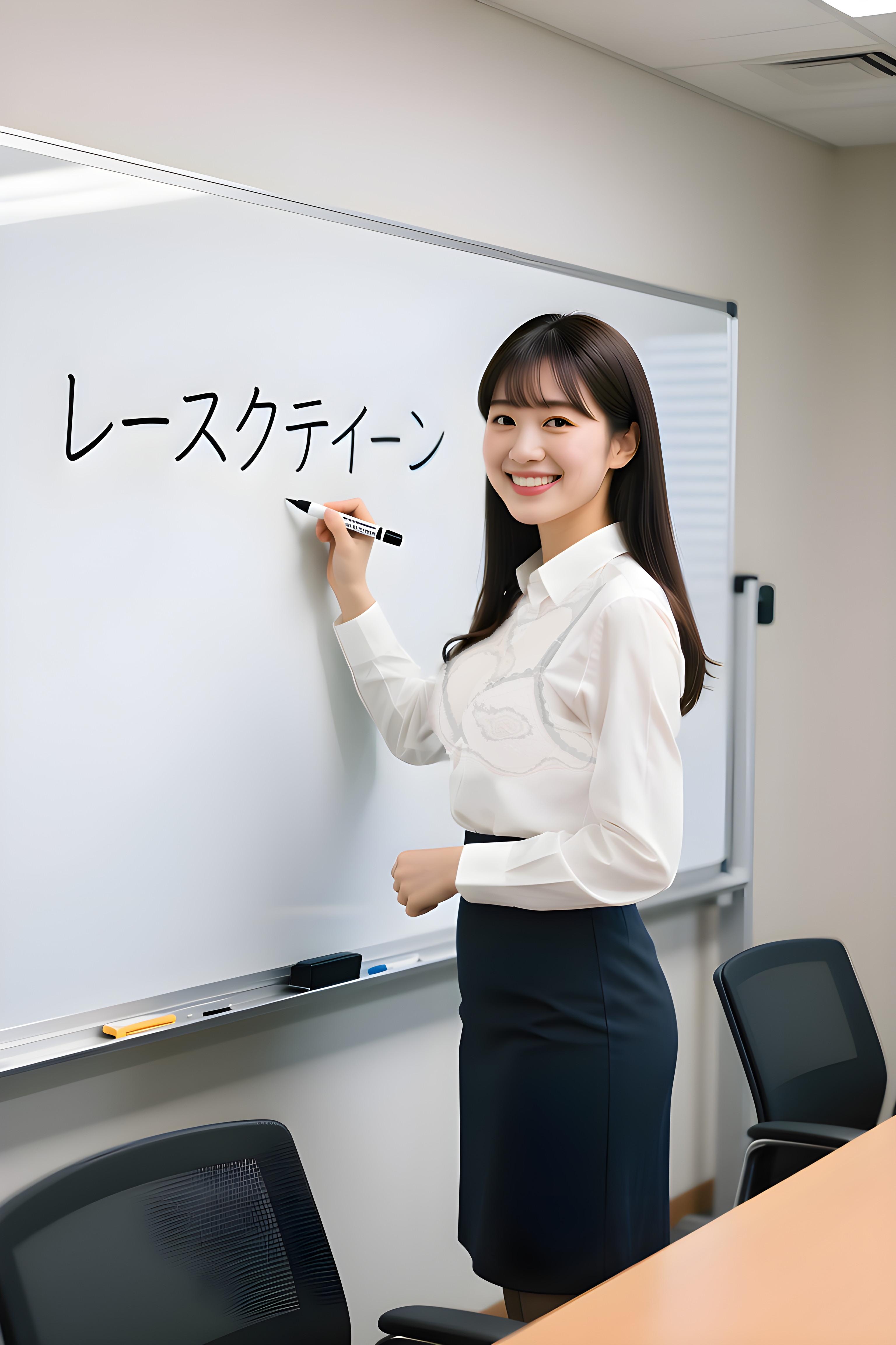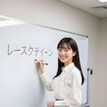 少しあわてんぼうの彼女はホワイトボードに誤って書いてしまい、軽くはにかんだ