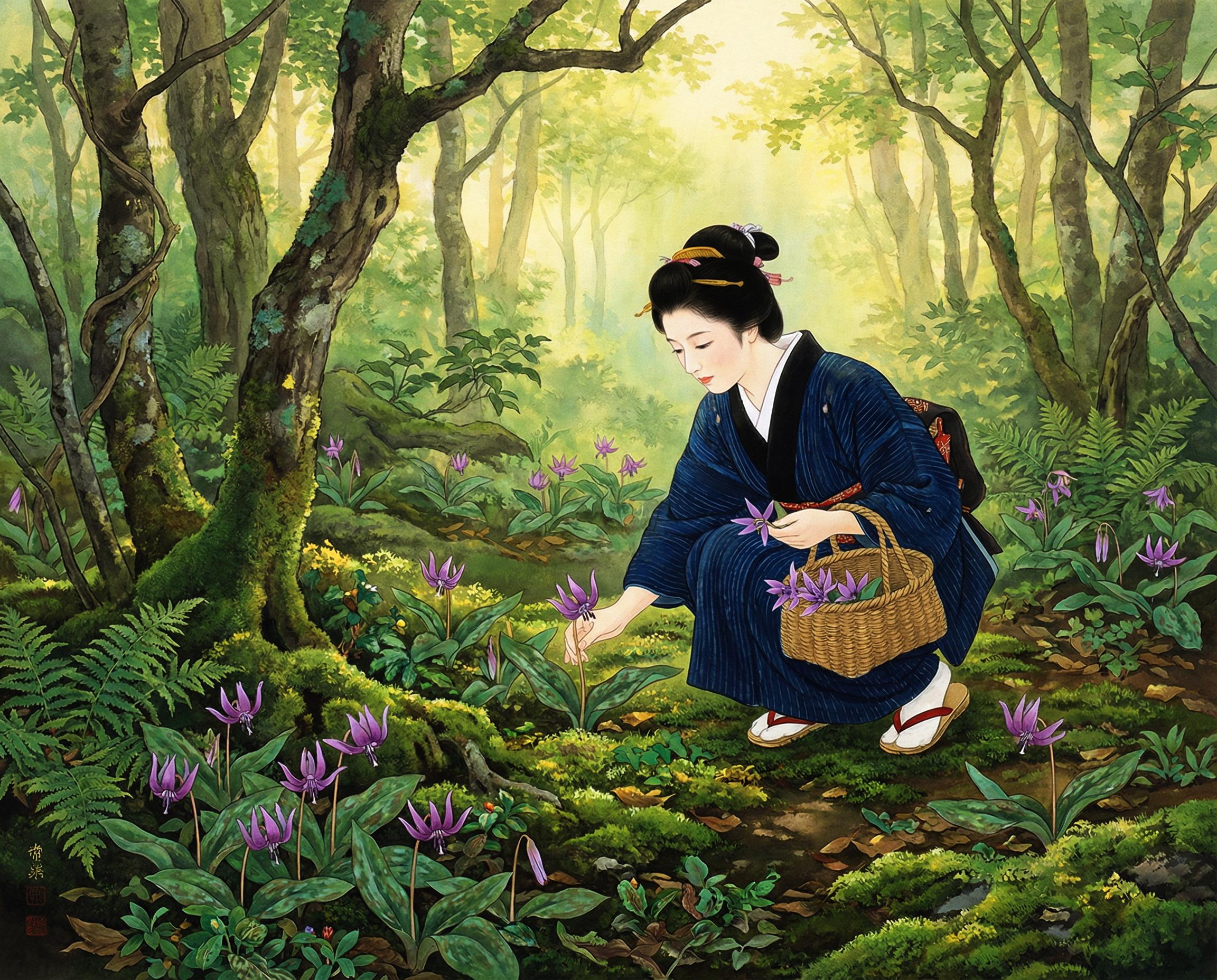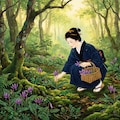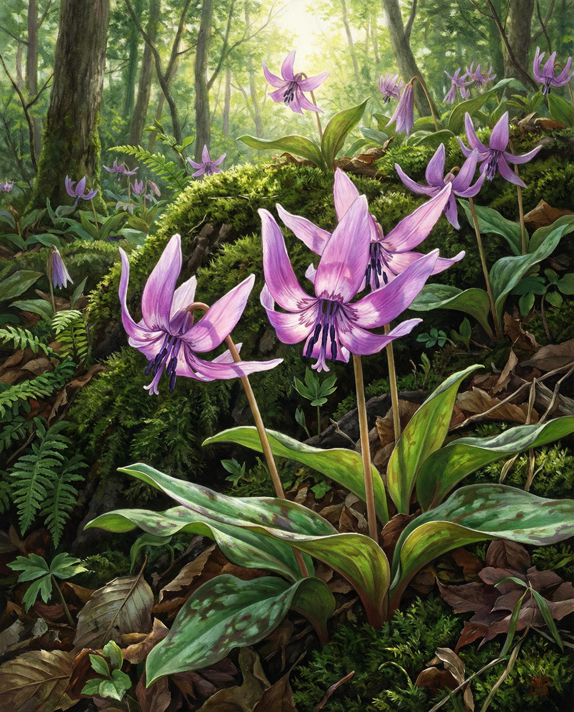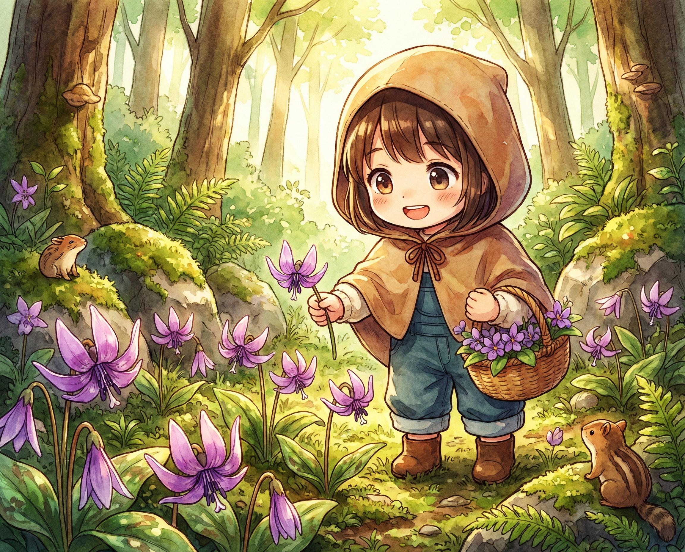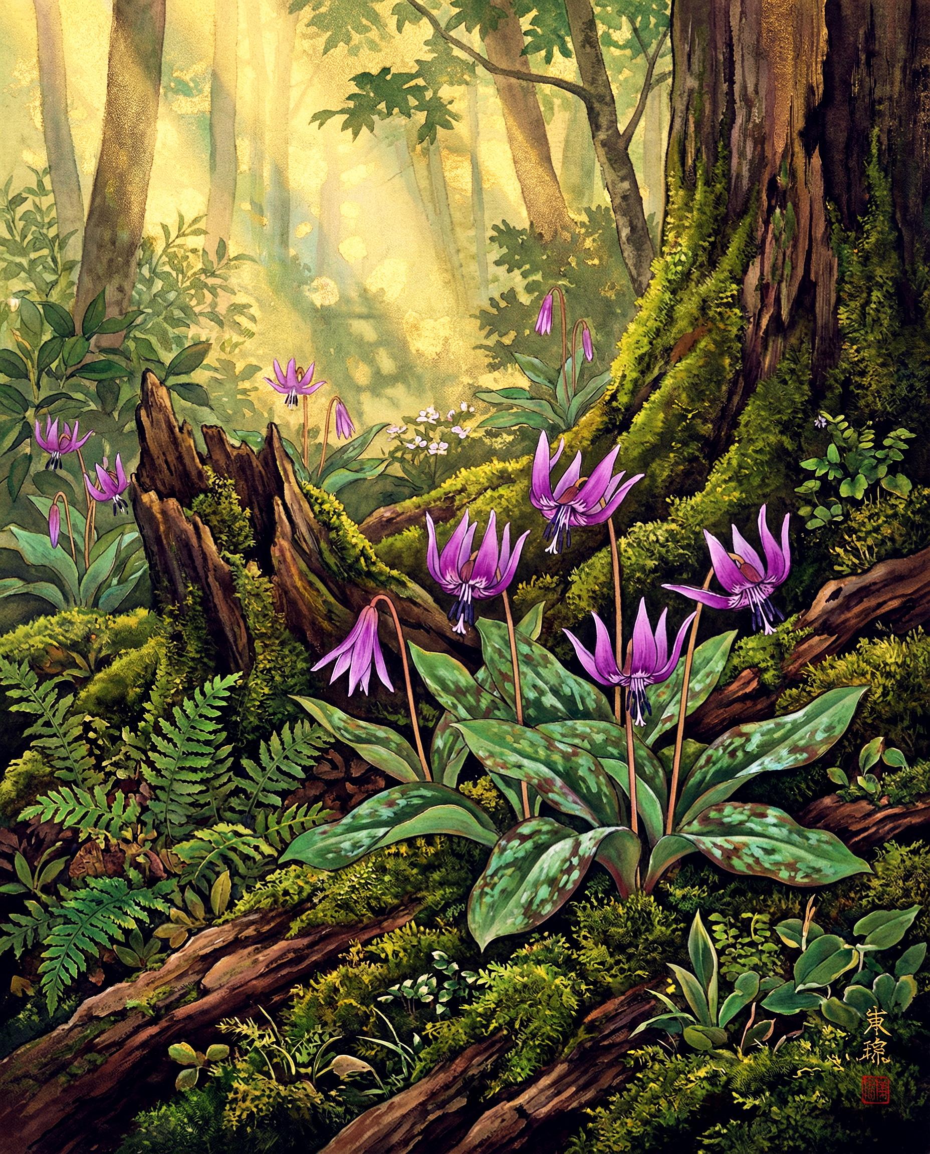 おそらく小石川という名称からピンとくるように、もともとは薬草を育てるための薬草園として江戸時代に造られた施設。カタクリは片栗粉の原料となる植物なので薬草というのとは少し違うかも知れませんが、今どきは植物園にでも行かなければ滅多に見られない花です。なお絵のように花を摘んでも何の役にも立ちません。片栗粉になるのは根だそうです。私は京都植物園と六甲山の高山植物園(?)で見たことがあります。