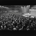 A wide-angle photograph capturing the historic unveiling of the first-generation Toyopet Crown (RS model) at a major Japanese event hall in 1955. Crowds dressed in 1950s attire fill the venue, their excited expressions fixed on the stage. Under bright spotlights, the car positioned at the center of the stage symbolizes Japan's pride in its postwar technology. Vintage photo aesthetics, high contrast, cinematic composition, panoramic framing.