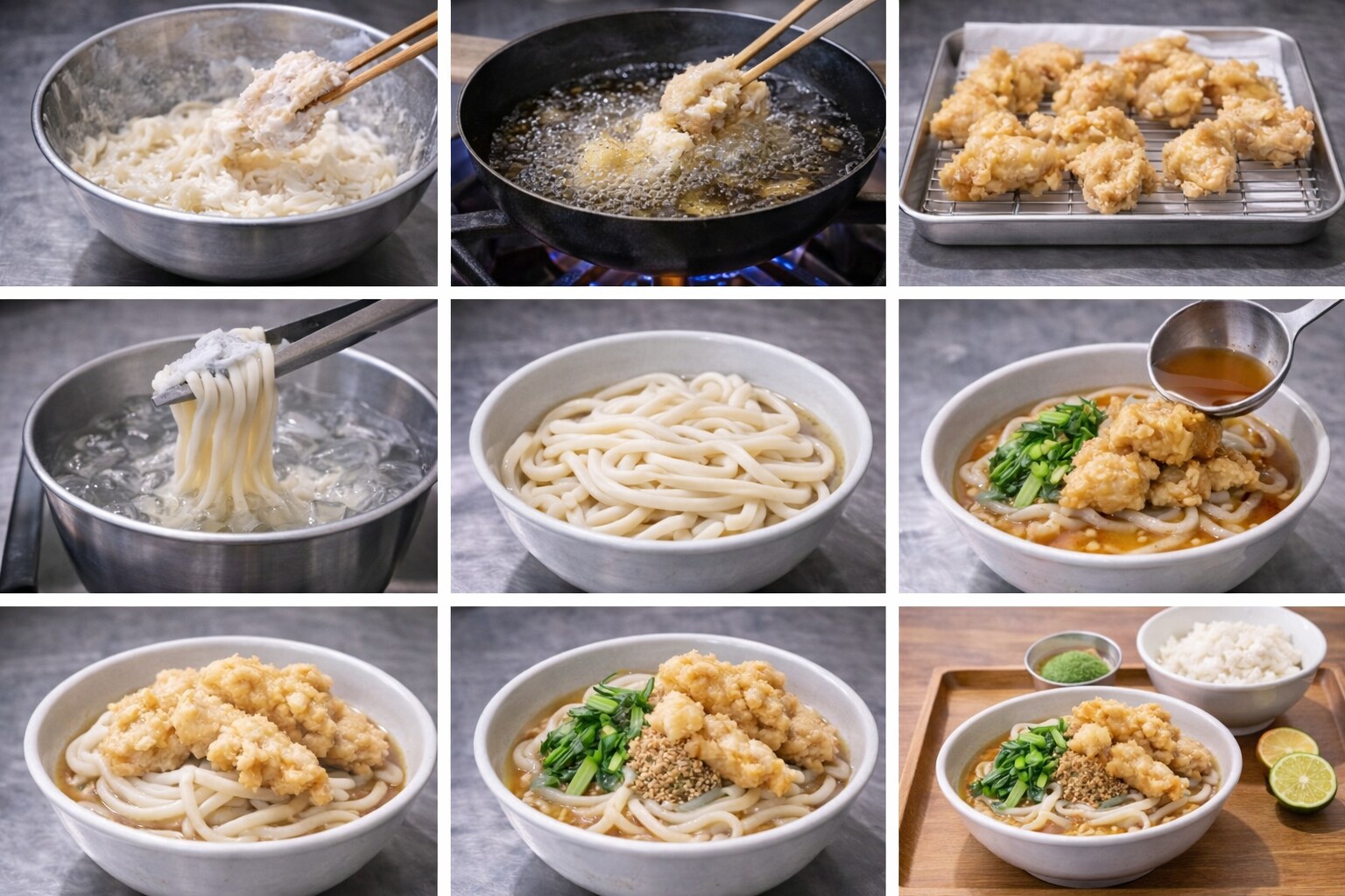 木製テーブルに置かれた瞬間、まず“温度”が目に見える。艶をまとったうどんはきゅっと締まり、出汁は澄んだ色で静かに香る。その上に乗る鶏天だけが、揚げたての熱を抱えている。冷と温、柔とサク。最初の景色だけで、今日は勝っている。