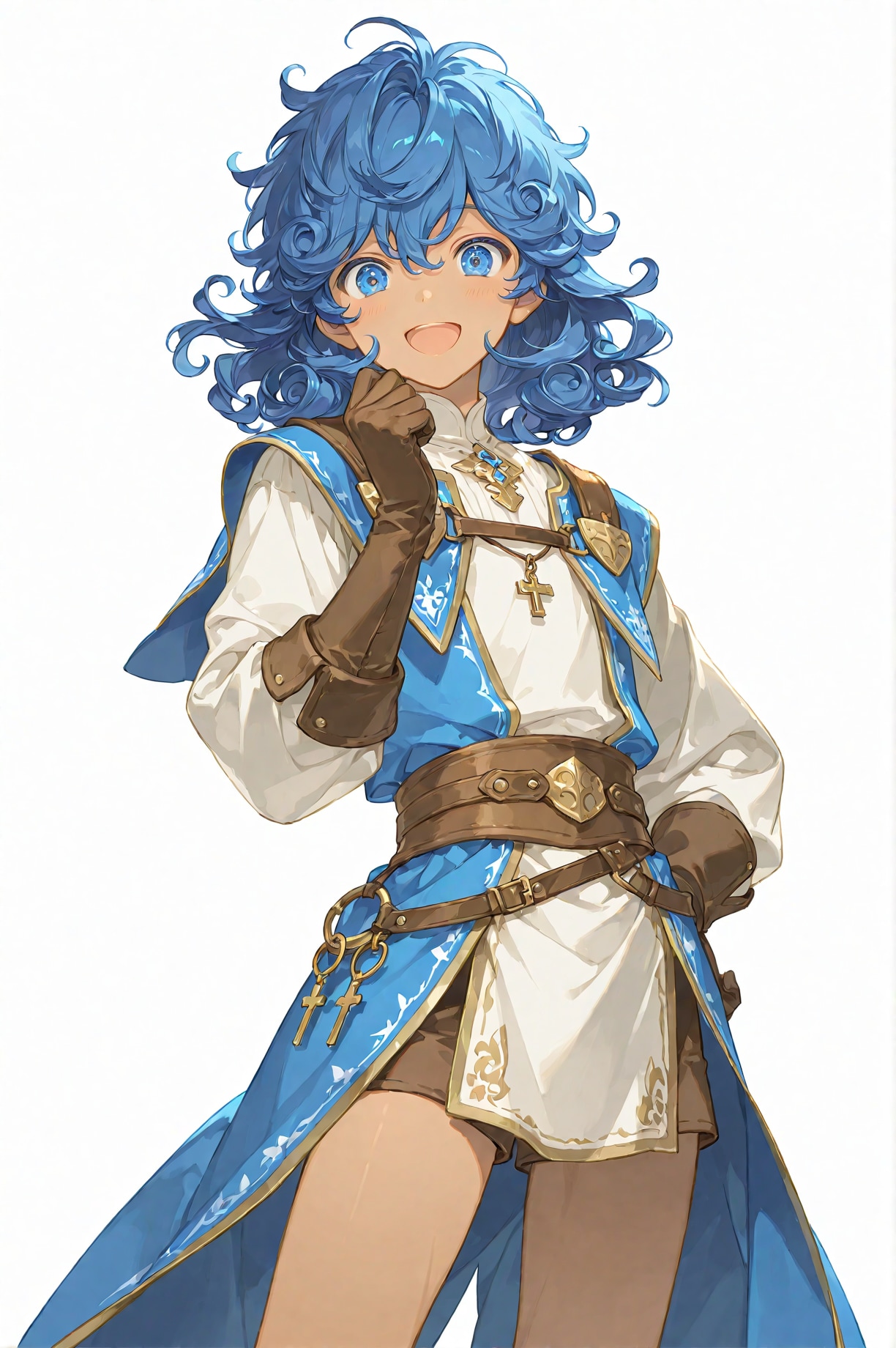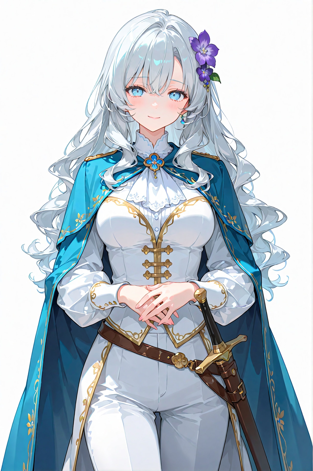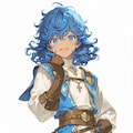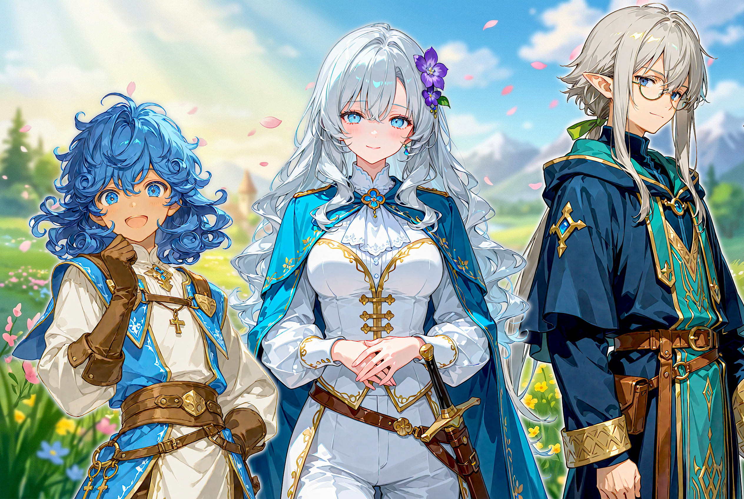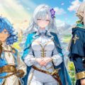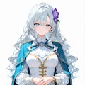 ローリエ:銀髪に異国の硝子細工のような空色の瞳(指定はlight blue)、マントも青。髪飾りが紫なのがアクセント