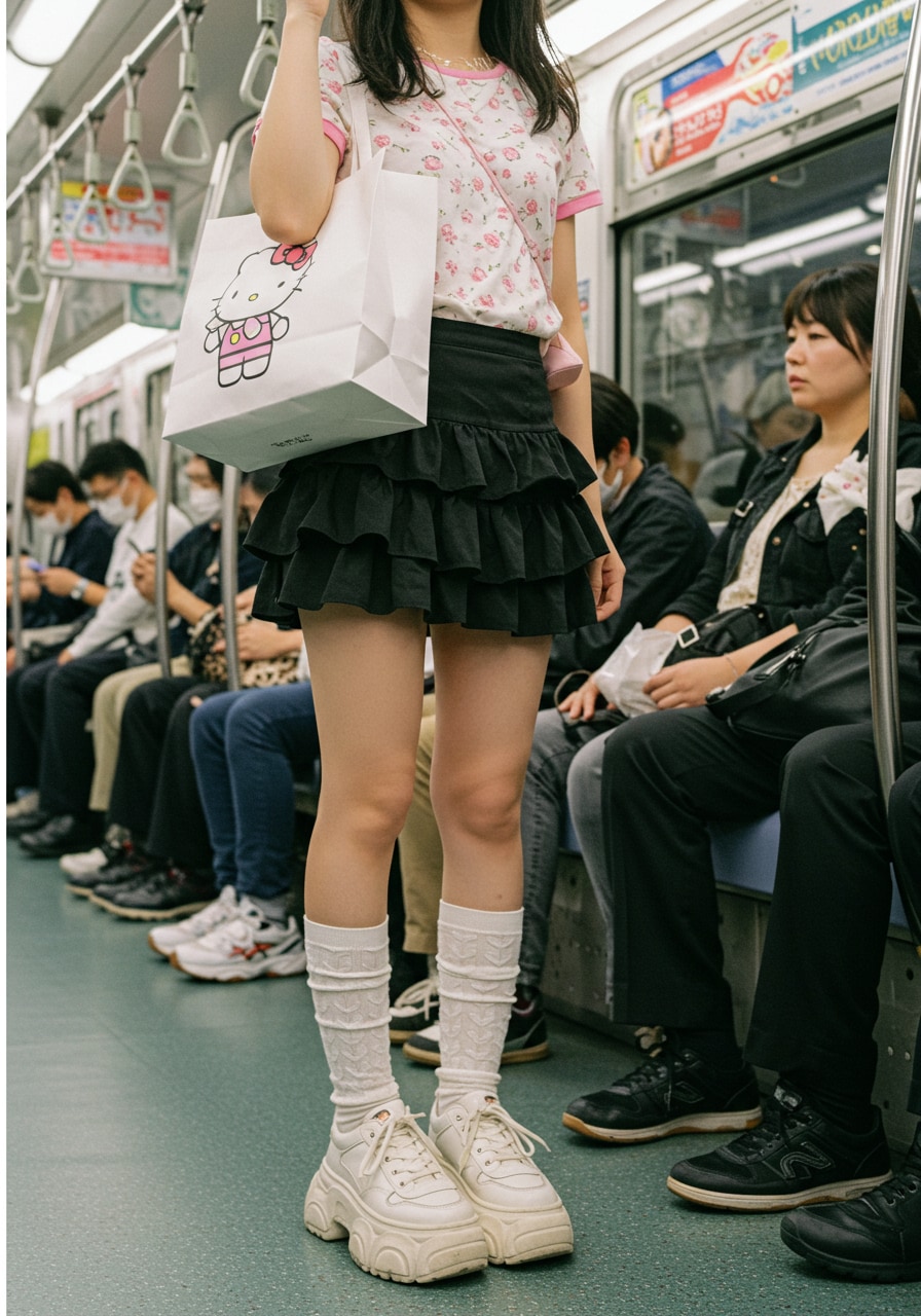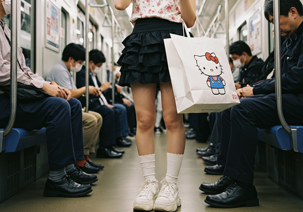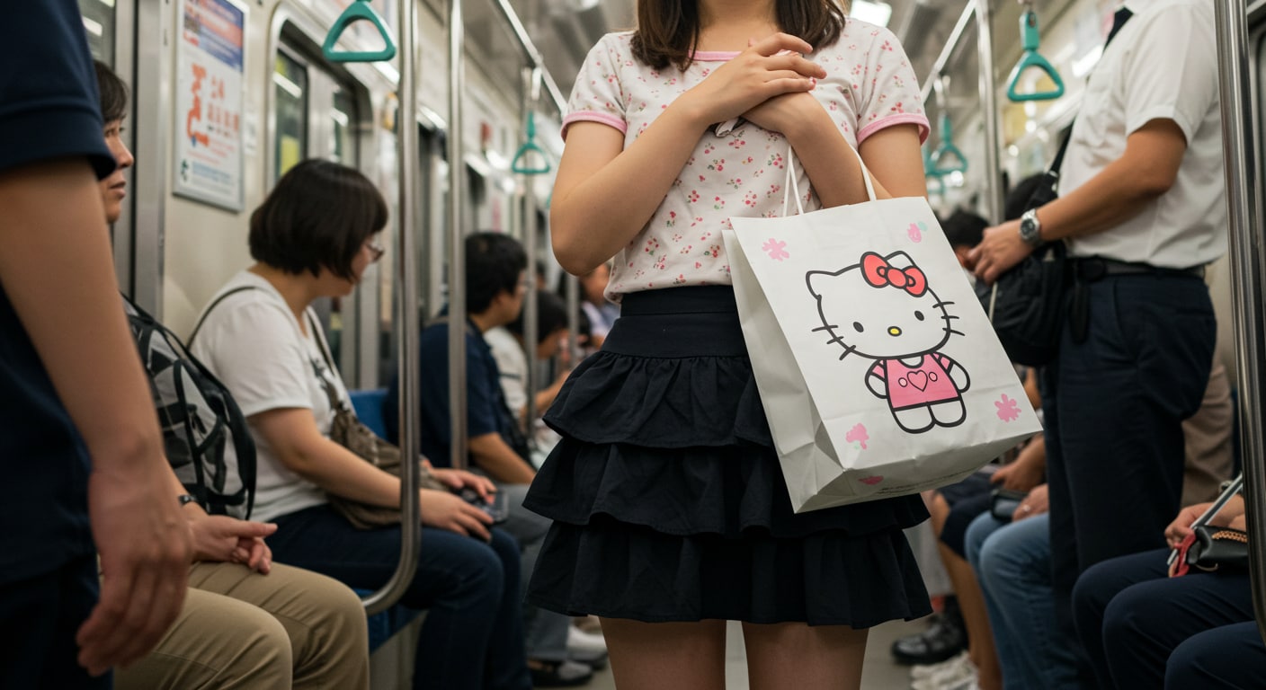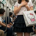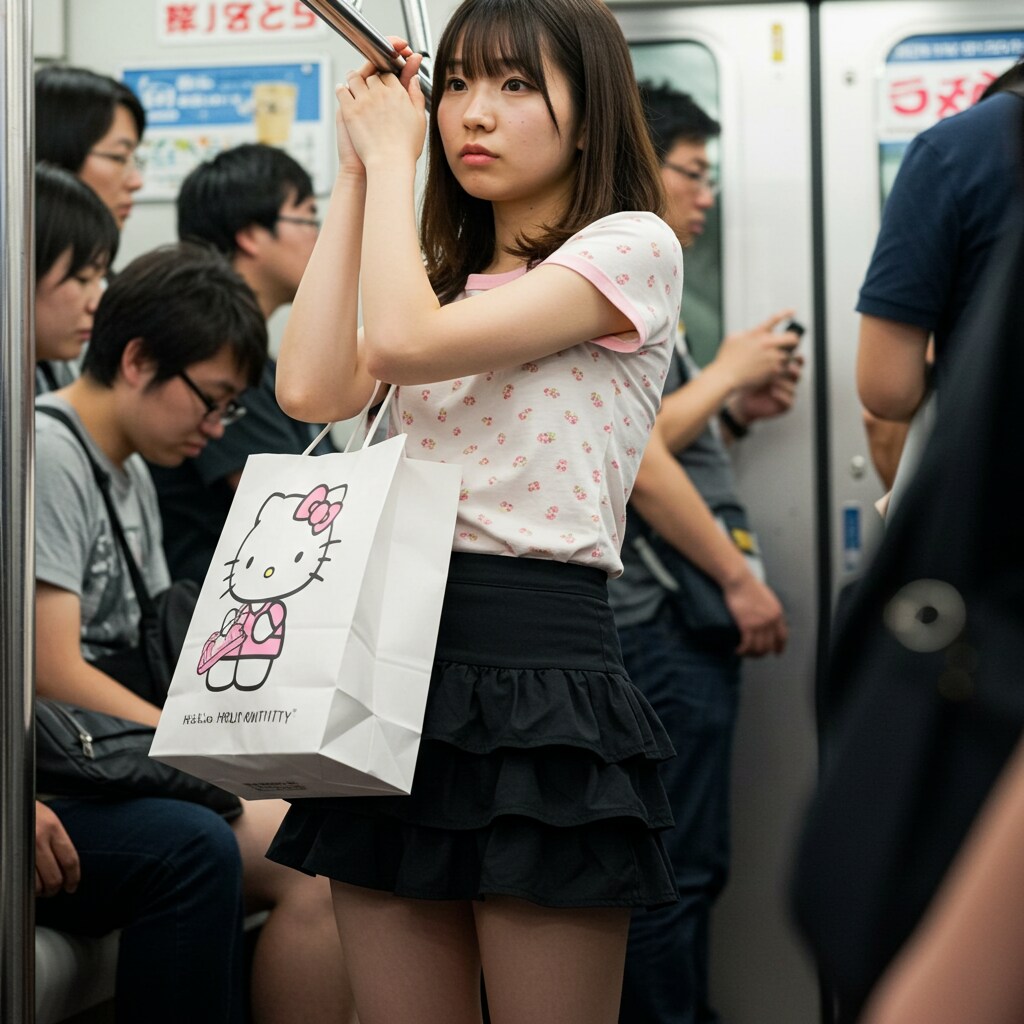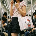 キティーちゃんの絵の大きすぎる紙袋を肩に掛け吊革につかまってる