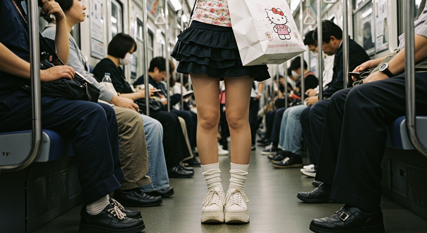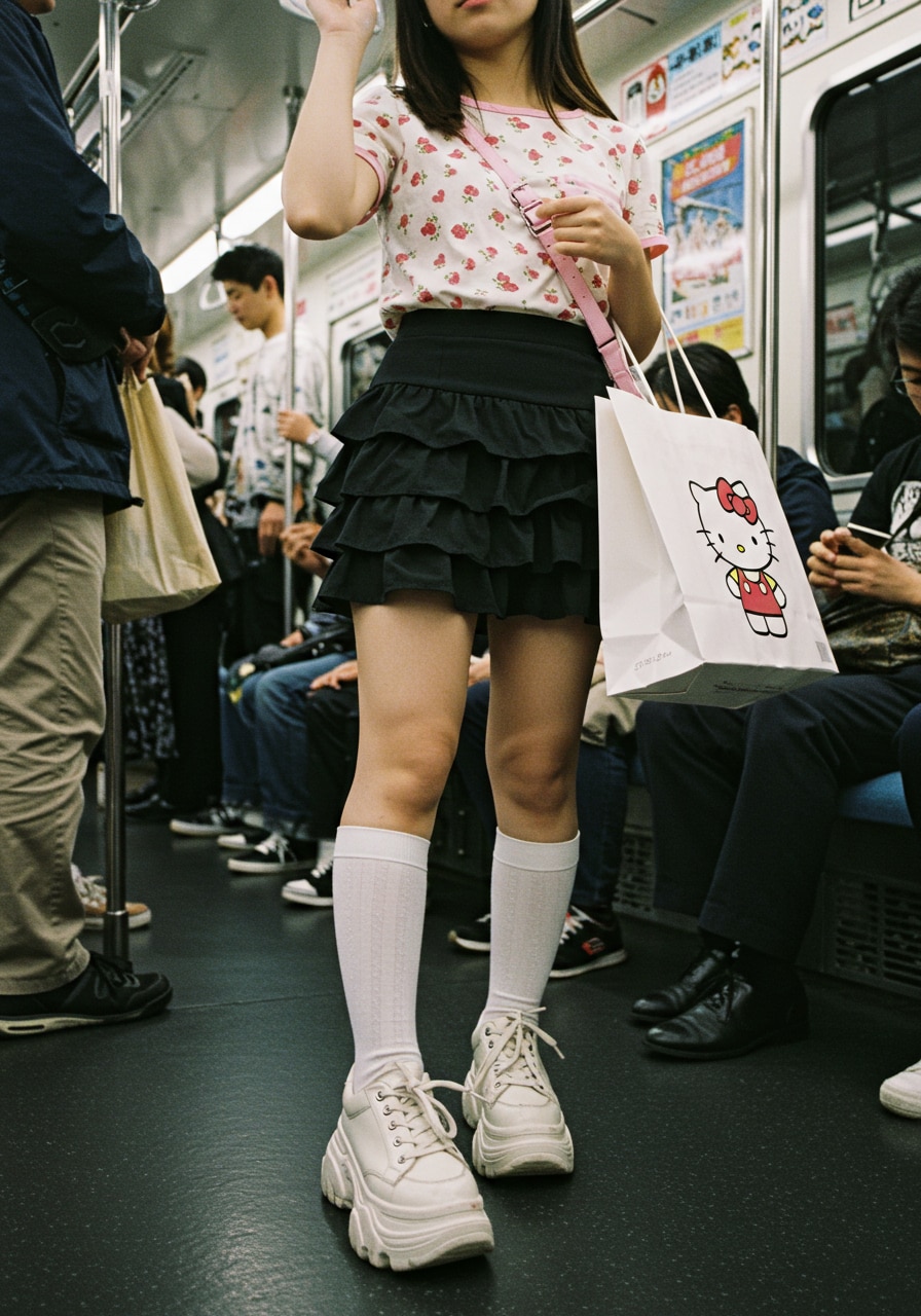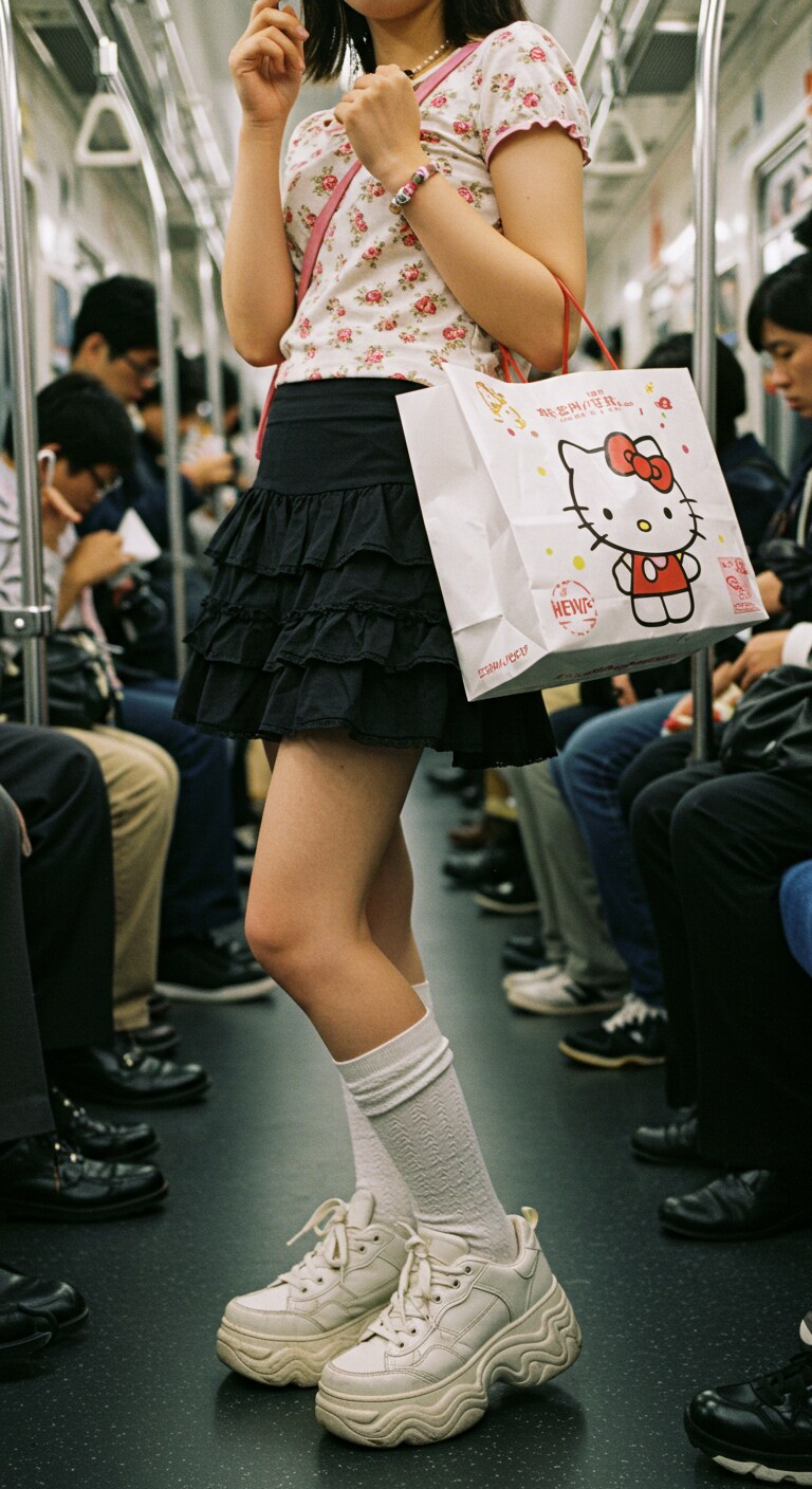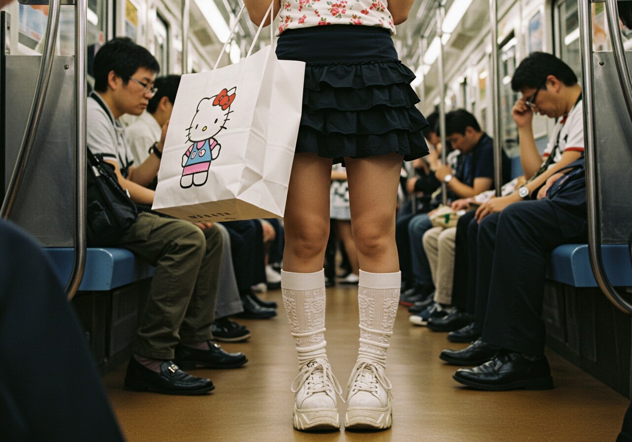 キティーちゃんの絵の大きすぎる紙袋を肩に掛け吊革につかまってる