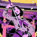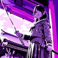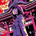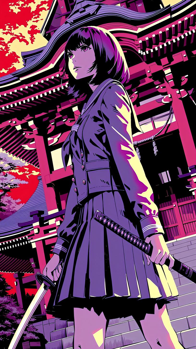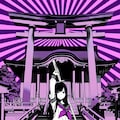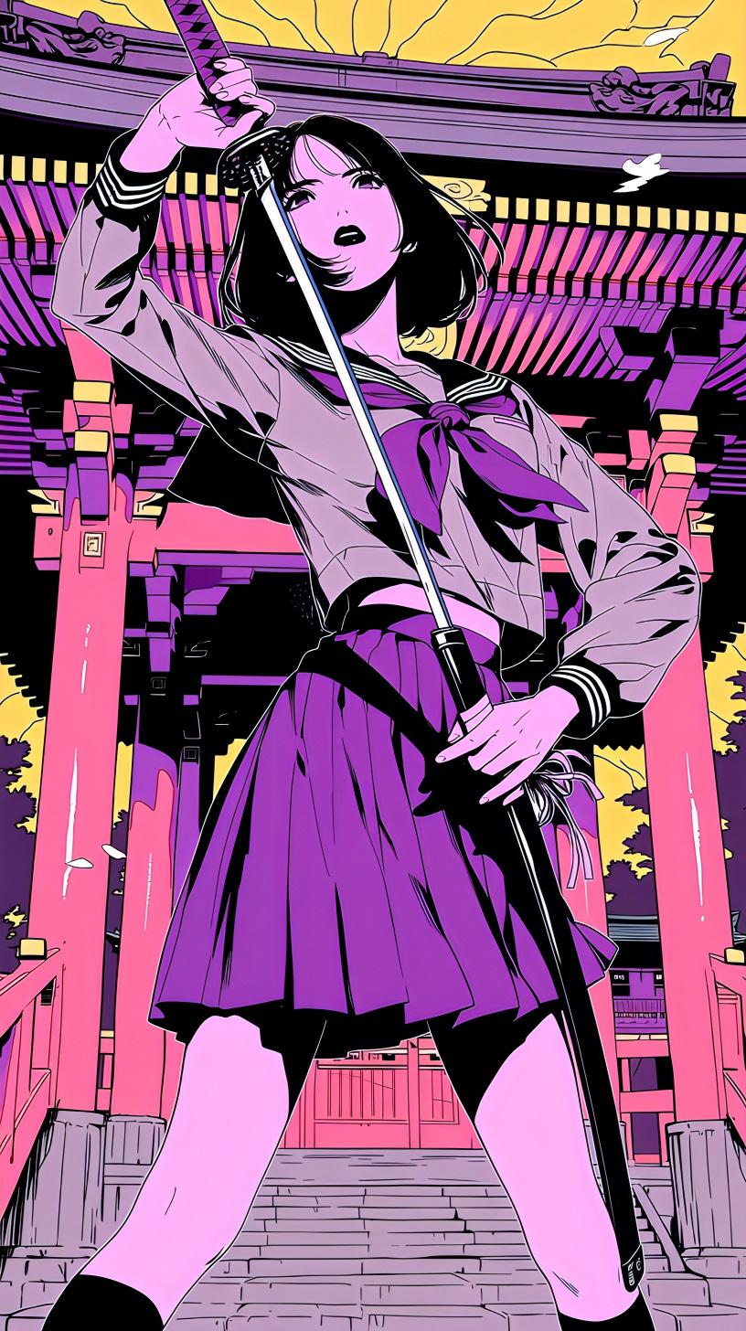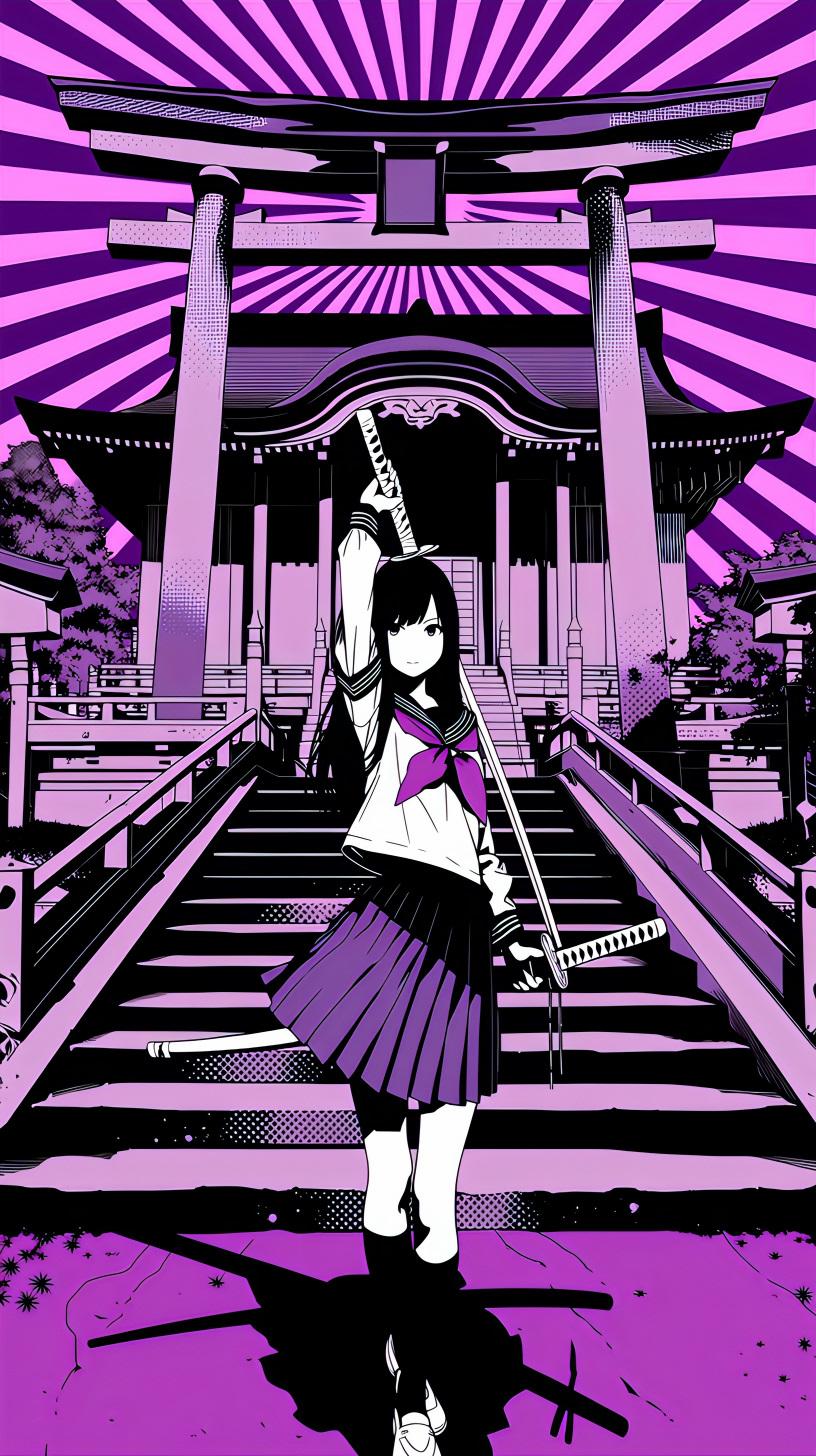紫に染まる夕暮れの神社で、黒髪の少女が刀を握りしめる。