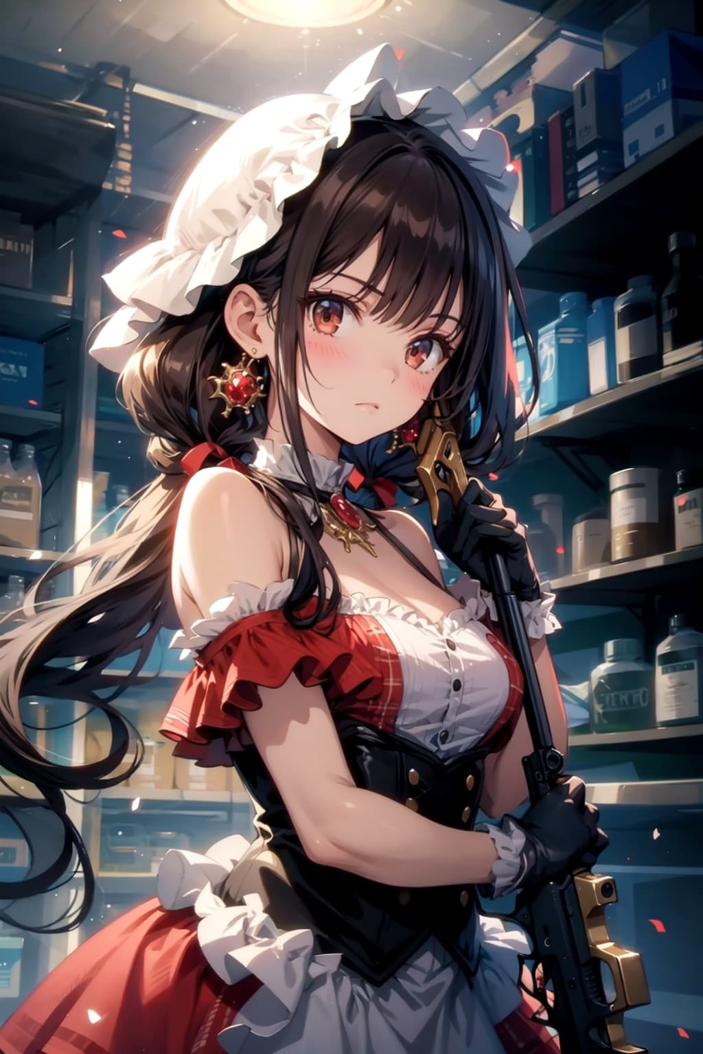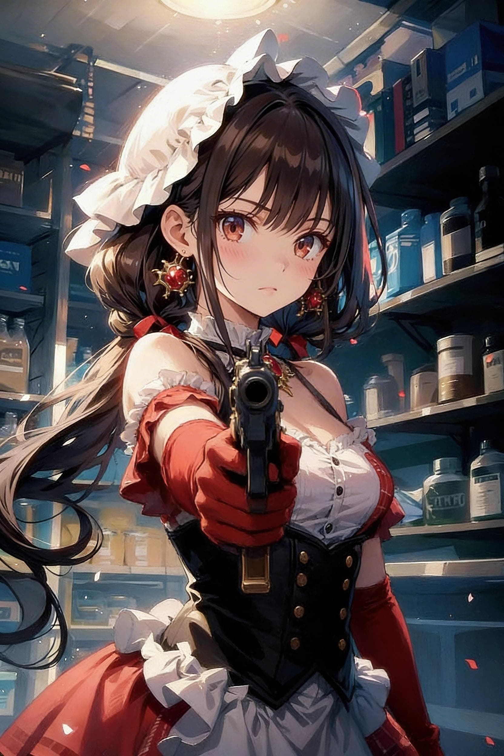 画像の生成:添付した画像の女の子が手に持っている銃をviewerに向けている。ドレスと同じ紅色のエルボーグローブをつけてください。添付した画像の塗り、画風、スタイルは維持すること。