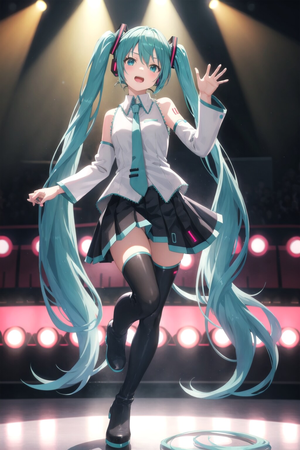 初音ミク、青緑の目、アクアの髪、超ロングヘア、ツインテール、ノースリーブの白いブレザー、アクアのネクタイ、黒いスカート、黒いアームカバー、黒いサイハイブーツ、