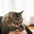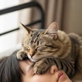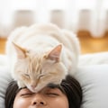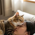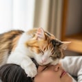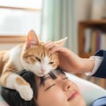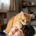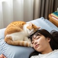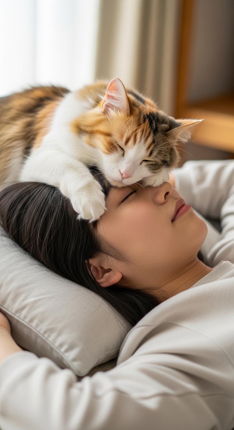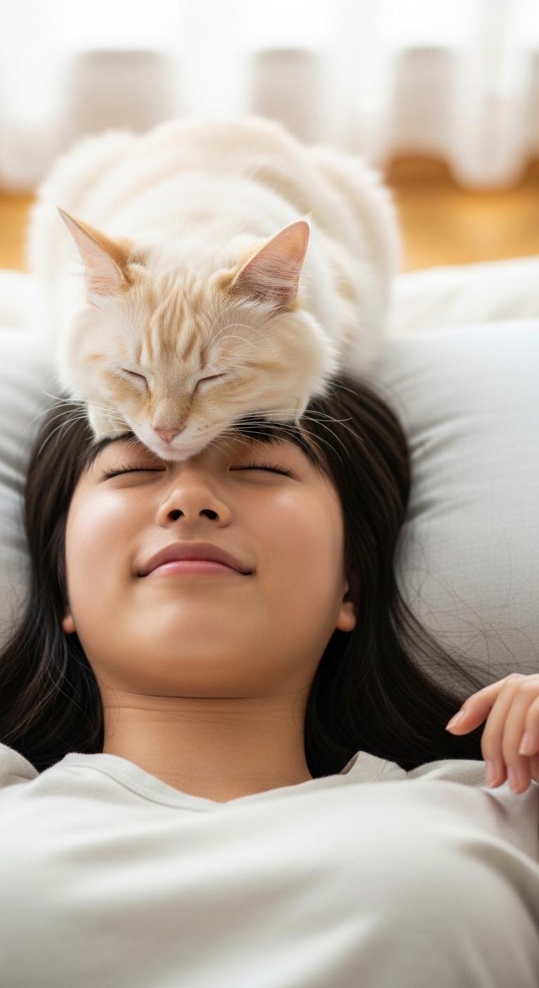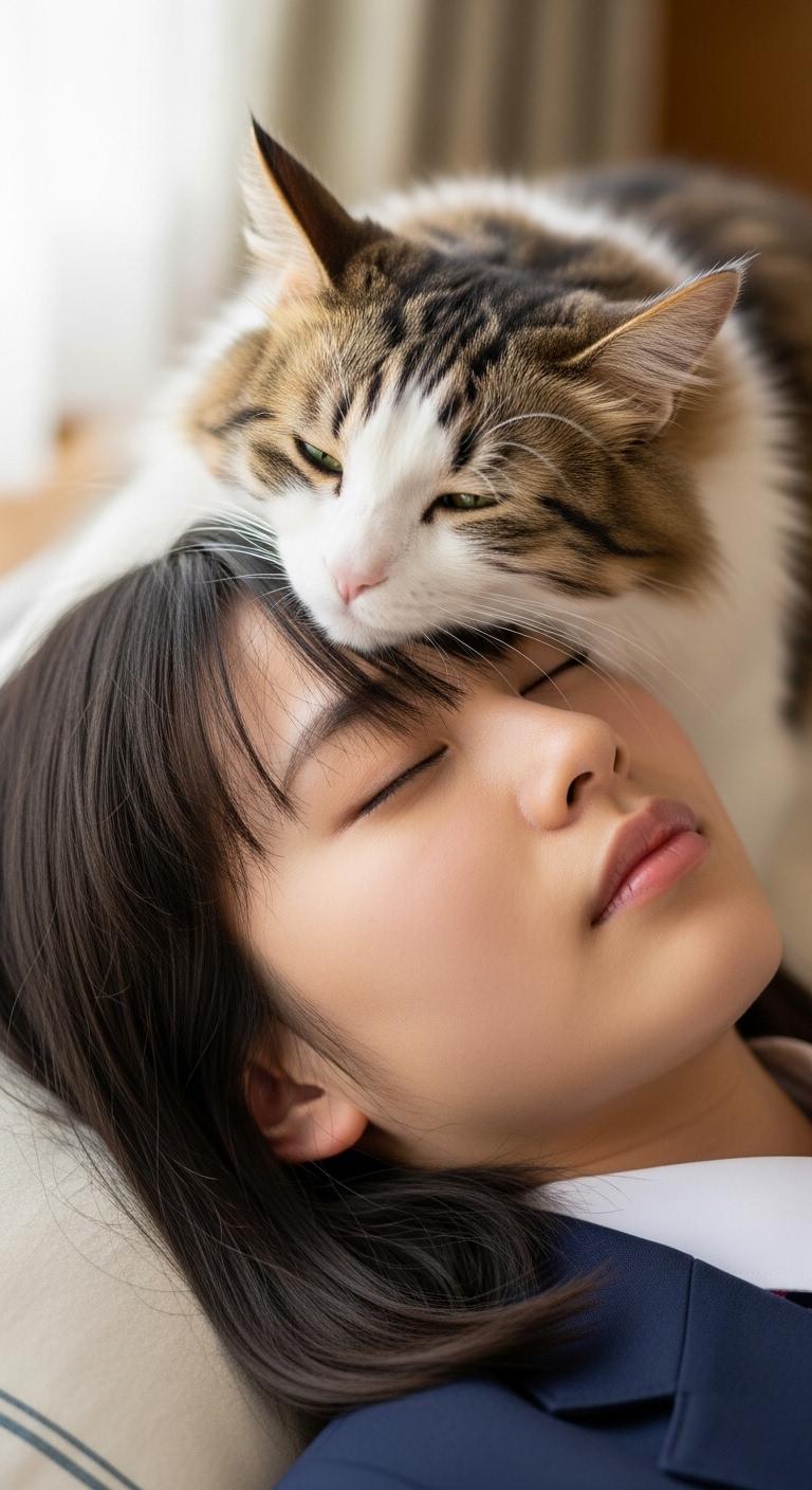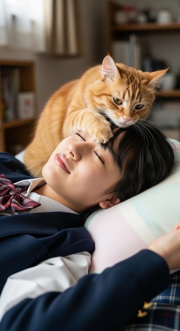 仰向けで寝ている日本人の可愛い女子高生のおでこ側から猫が目隠しをしているリアルフォトを作って。