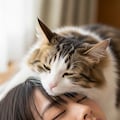 女子高生のおでこで心地よくおねんねしているにゃんにゃん。