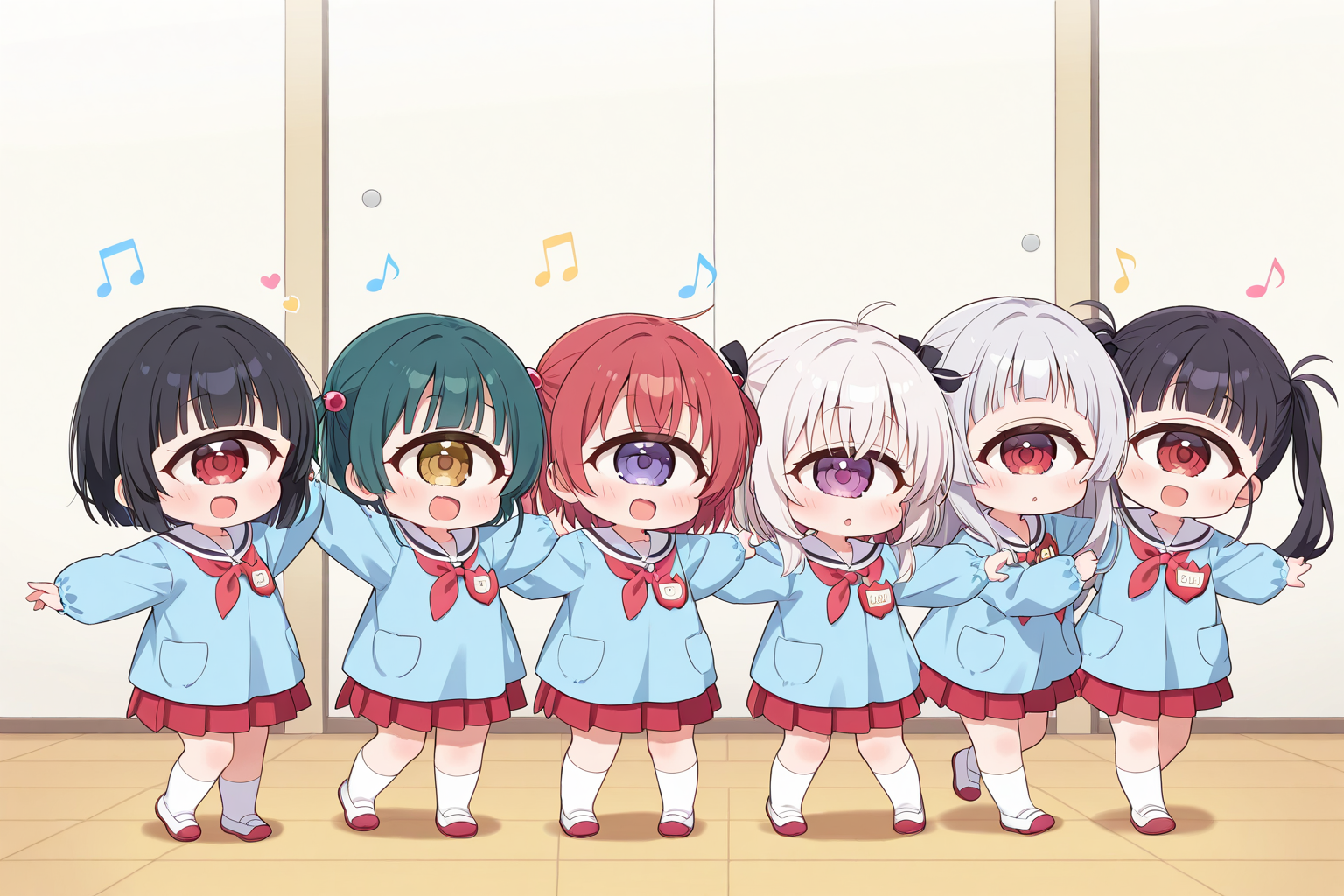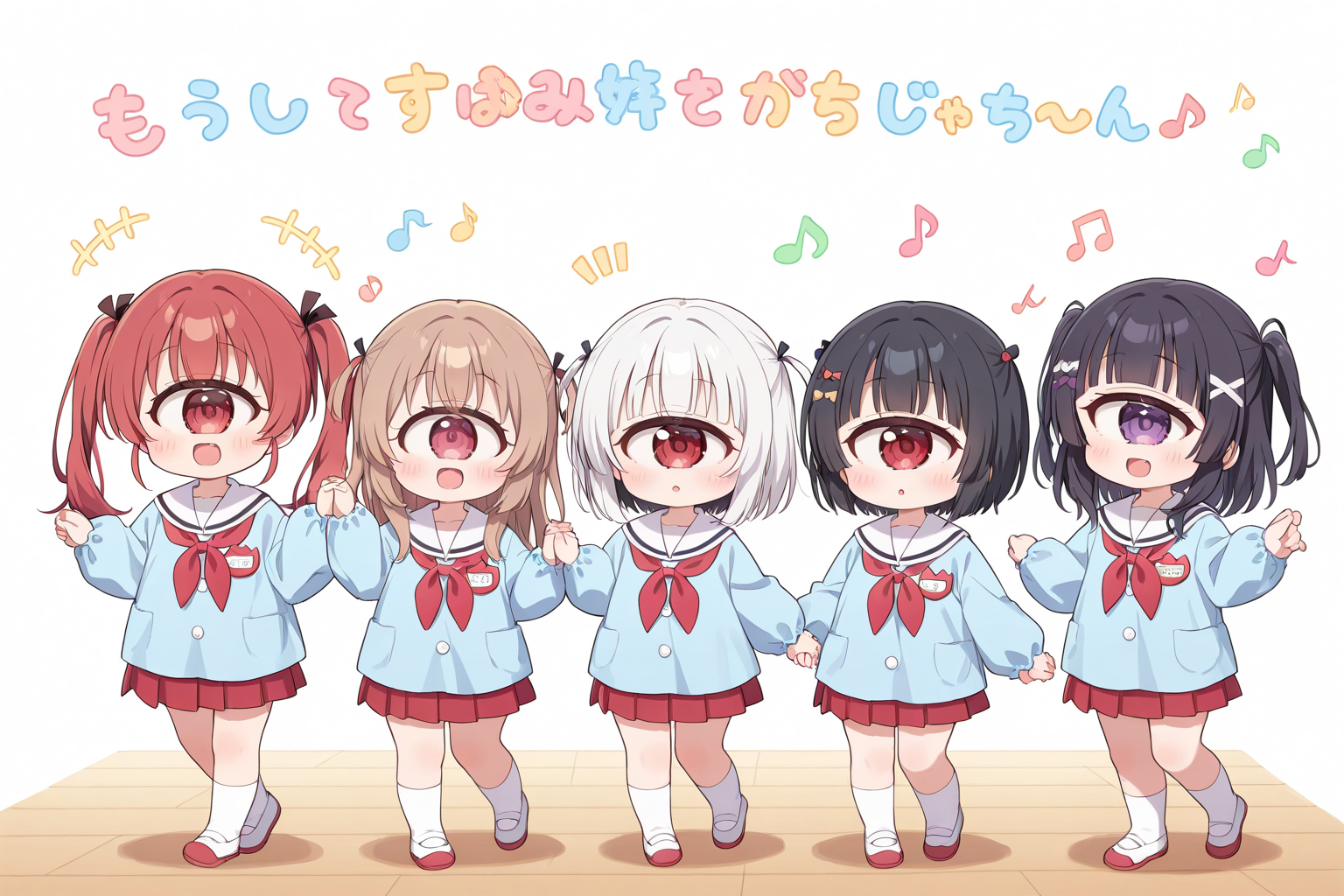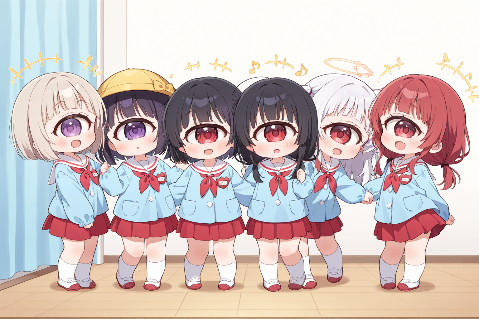 (white sailor_collar:1.3),(white smock),(white kindergarten uniform),(red_neckerchief),red pleated_skirt,white socks,uwabaki,