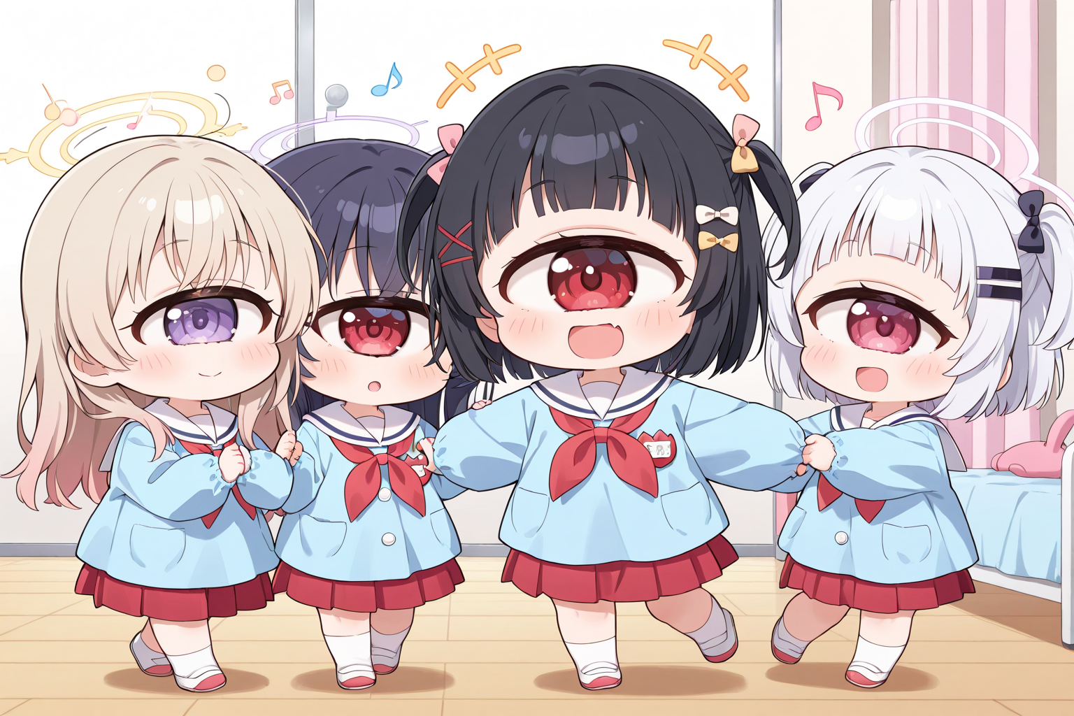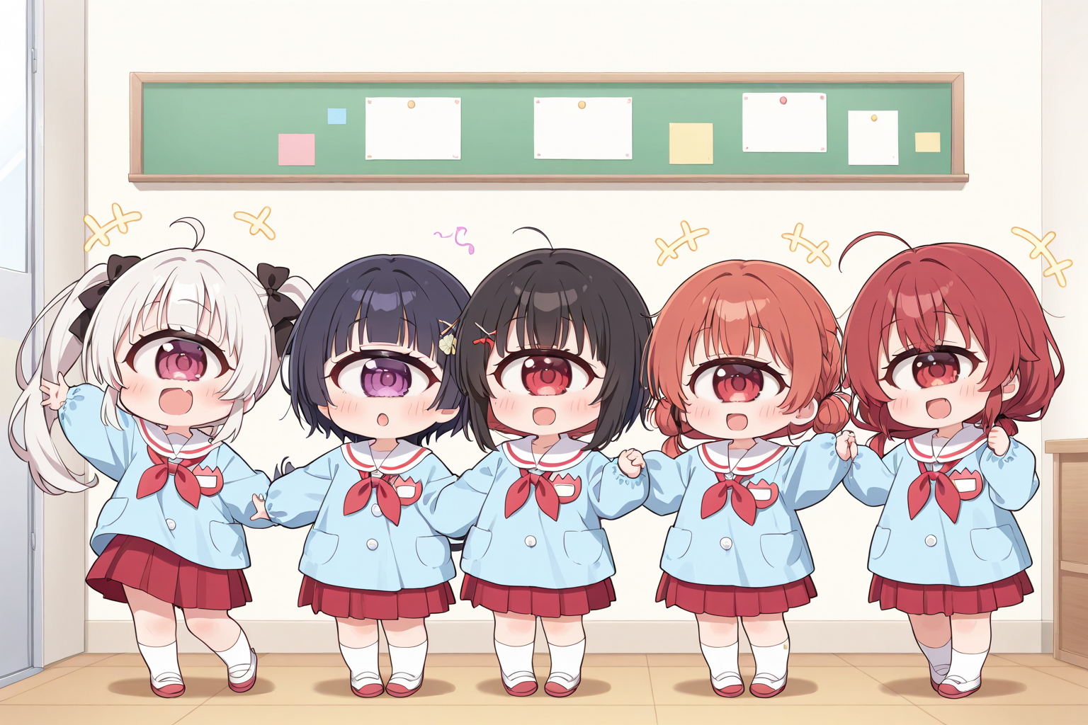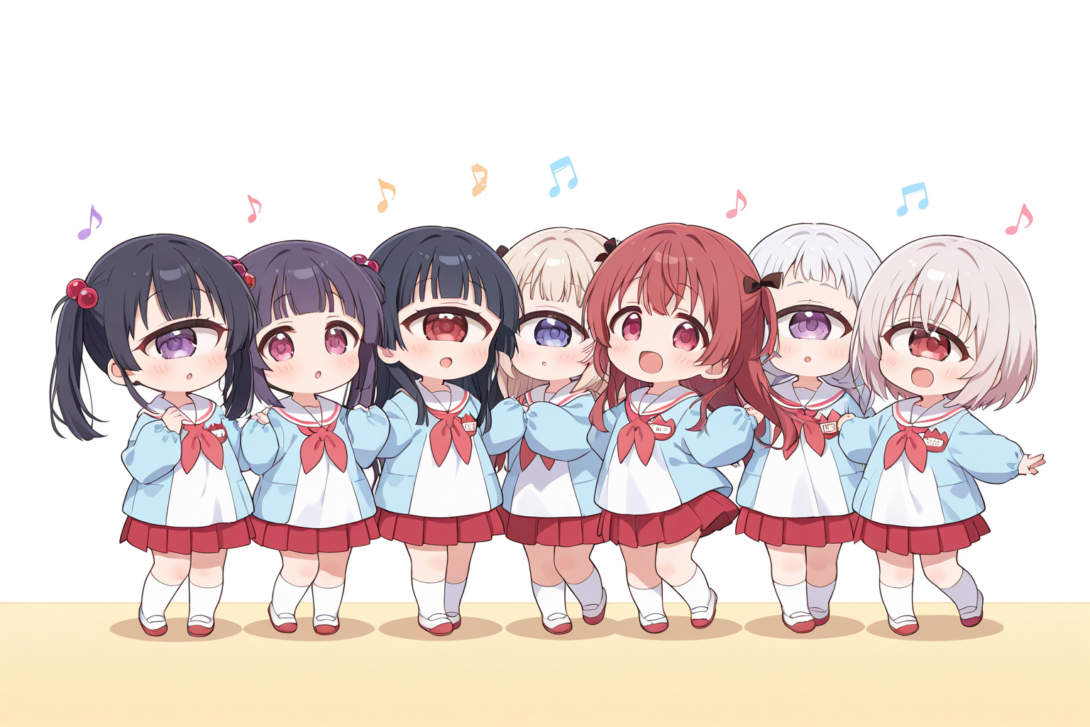 (white sailor_collar:1.3),(white smock),(white kindergarten uniform),(red_neckerchief),red pleated_skirt,white socks,uwabaki,