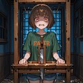 小さなギロチンの前で、男の子が恐怖に怯えています。