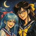 1970年代〜1980年代風のアニメイラスト、1人の女子高校生、右側は眼鏡をかけ黄色いリボンのセーラー服を着ている、もう一人左側は水色髪でピンクのリボンに青いセーラー服を着ている、夜空を背景にして立っている、視線と向きはレ斜め左方向で、レトロアニメ調、セル画風の色合い、シャープな線と影、昭和アニメの雰囲気、ドラマチックで渋い雰囲気,美人でセーラー服でかなり身長が高めで眼鏡の女子高校生と青白く垂れ目にピンクのリボンに青のセーラー服で痩せ気味の身長の高い女子高校生,各々が悪そうに悪い顔で二人が口を歪めて笑っている、1970年代風なアニメイラストを縦長で作って下さい