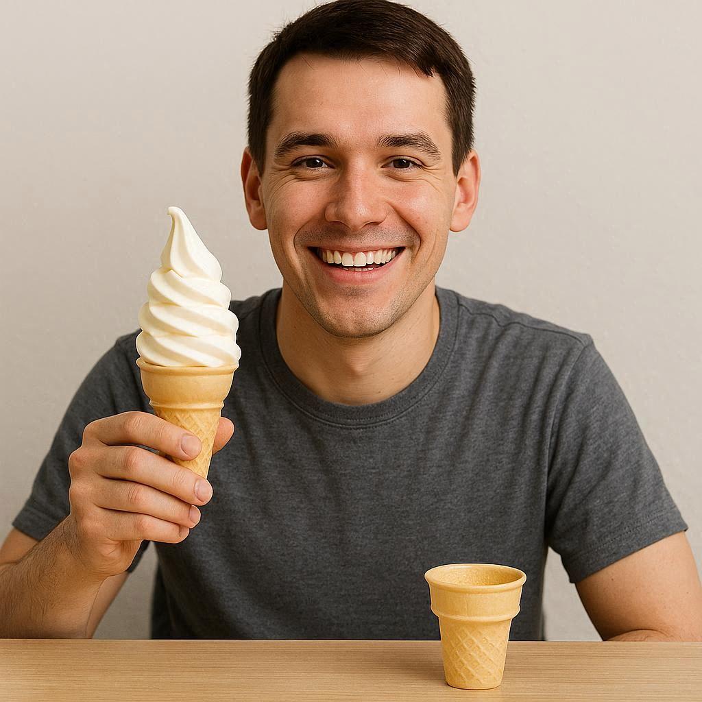 ソフトクリームを持って微笑んでいる人。机の上には空のソフトクリームホルダー。